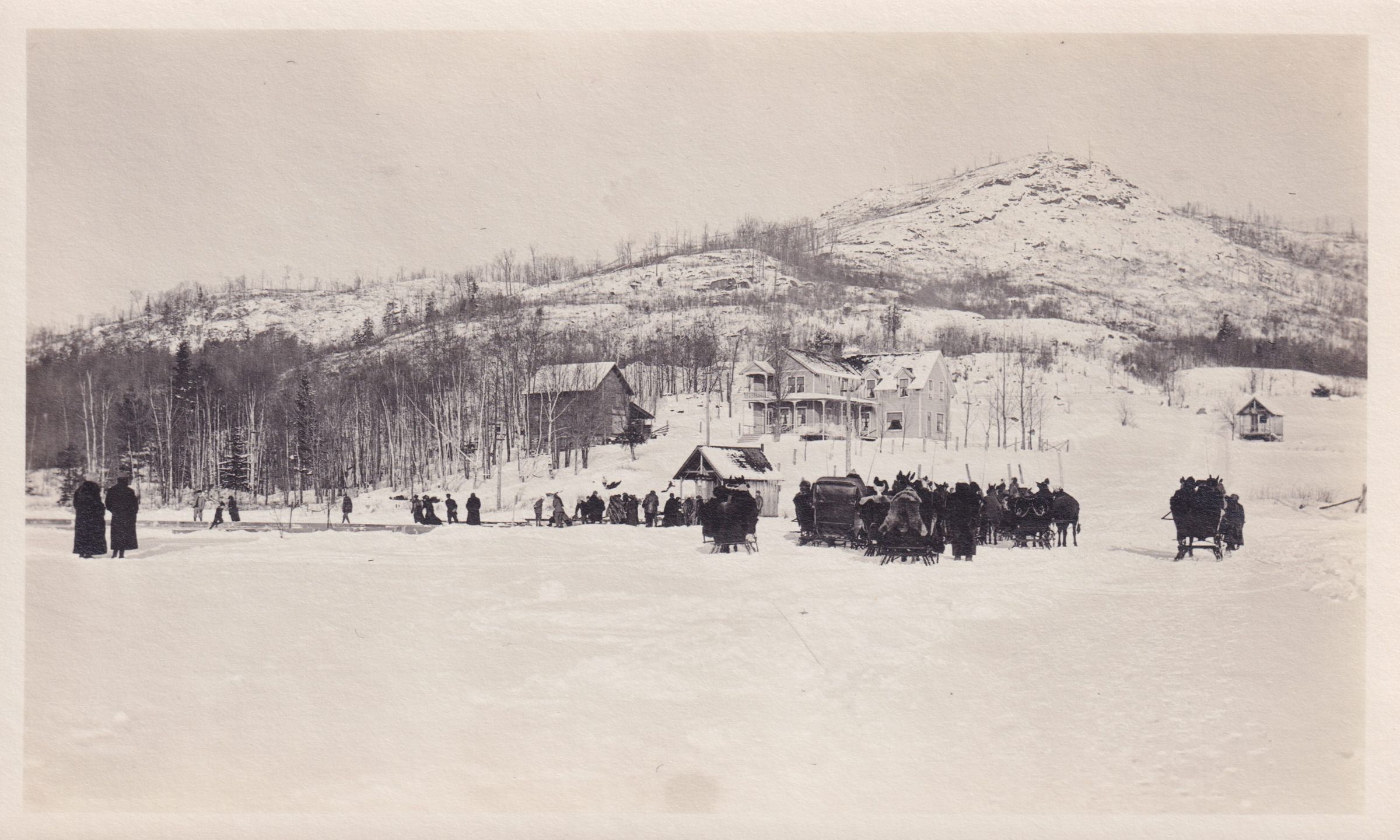 Photograph of a group of people and horse-drawn sleighs on the ice on Moody Pond. Mount Baker is visible in the background behind several unidentified buildings.