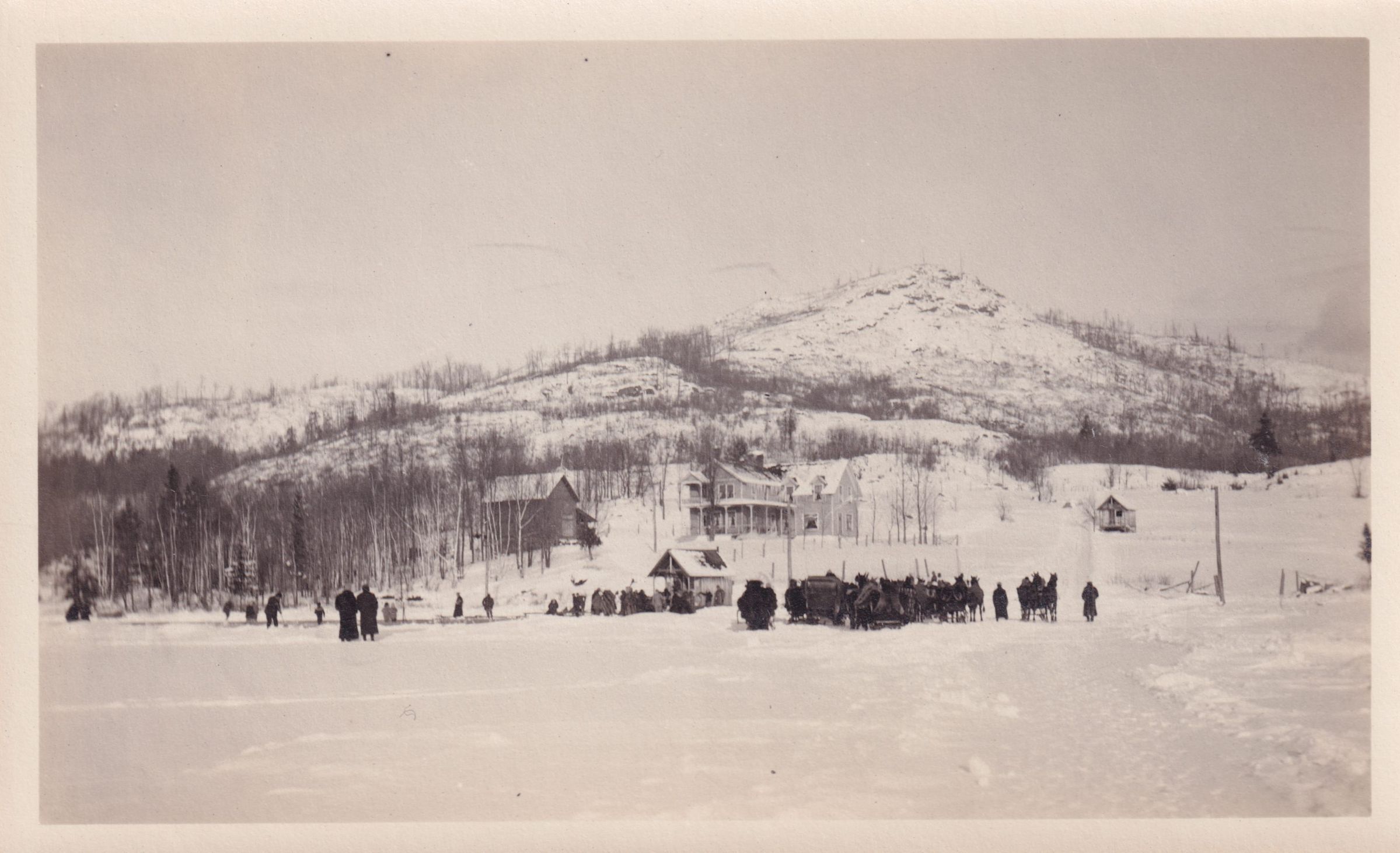 Photograph taken from a distance of a group of people and horse-drawn sleighs on the ice on Moody Pond. Mount Baker is visible in the background behind several unidentified buildings.