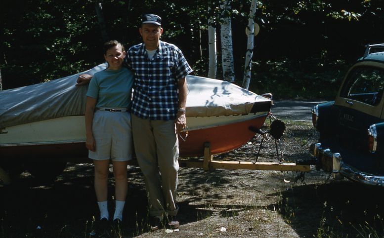 Color Kodachrome slide showing a man and woman next to a boat hitched to a car. This item is not fully cataloged but has been uploaded so the image is publicly available; if you would like us to prioritize cataloging this item, please contact the HSL Collections team.