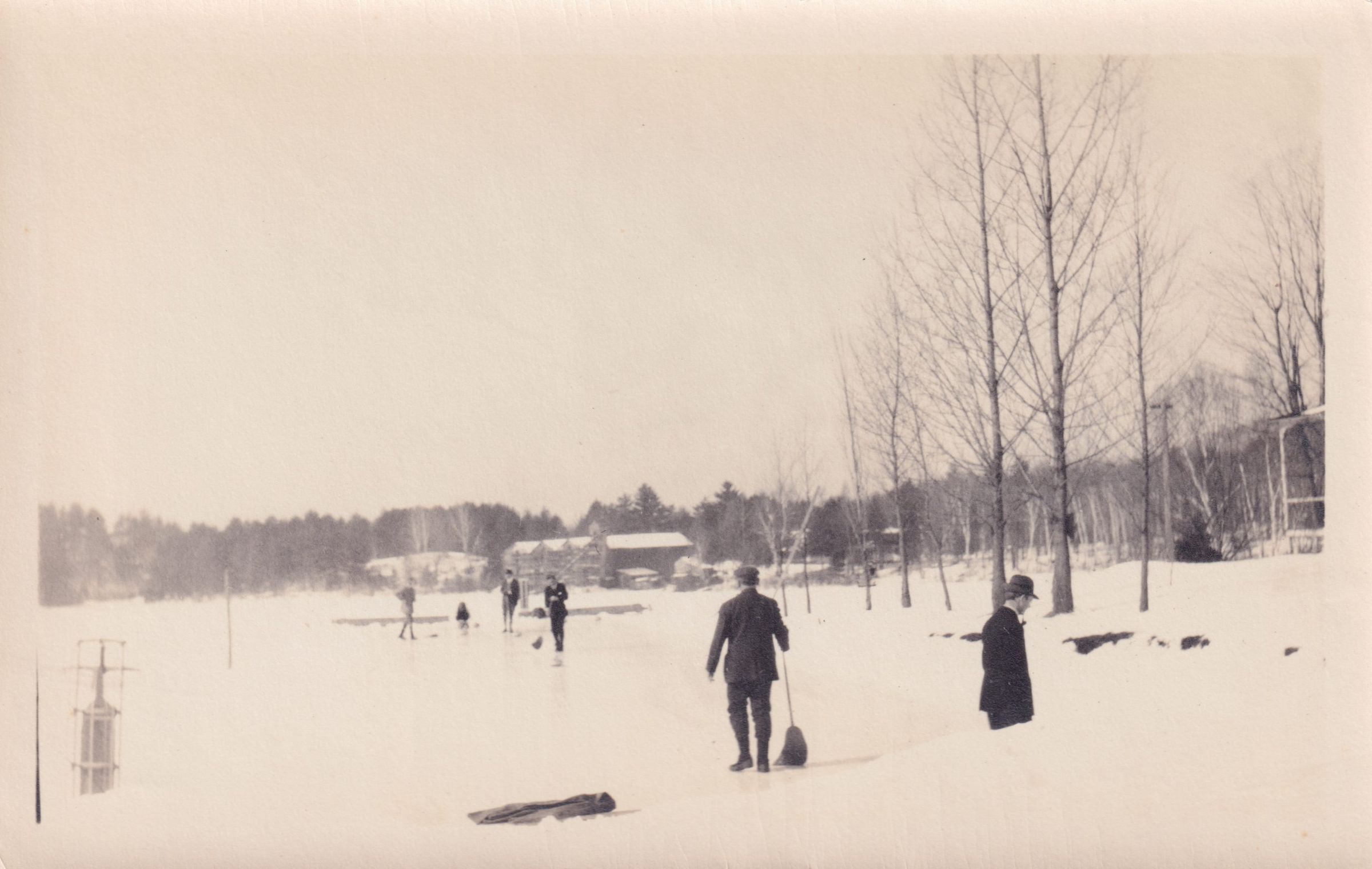 Photograph of people curling on Moody Pond. The Ice House is visible at the far end of the pond.