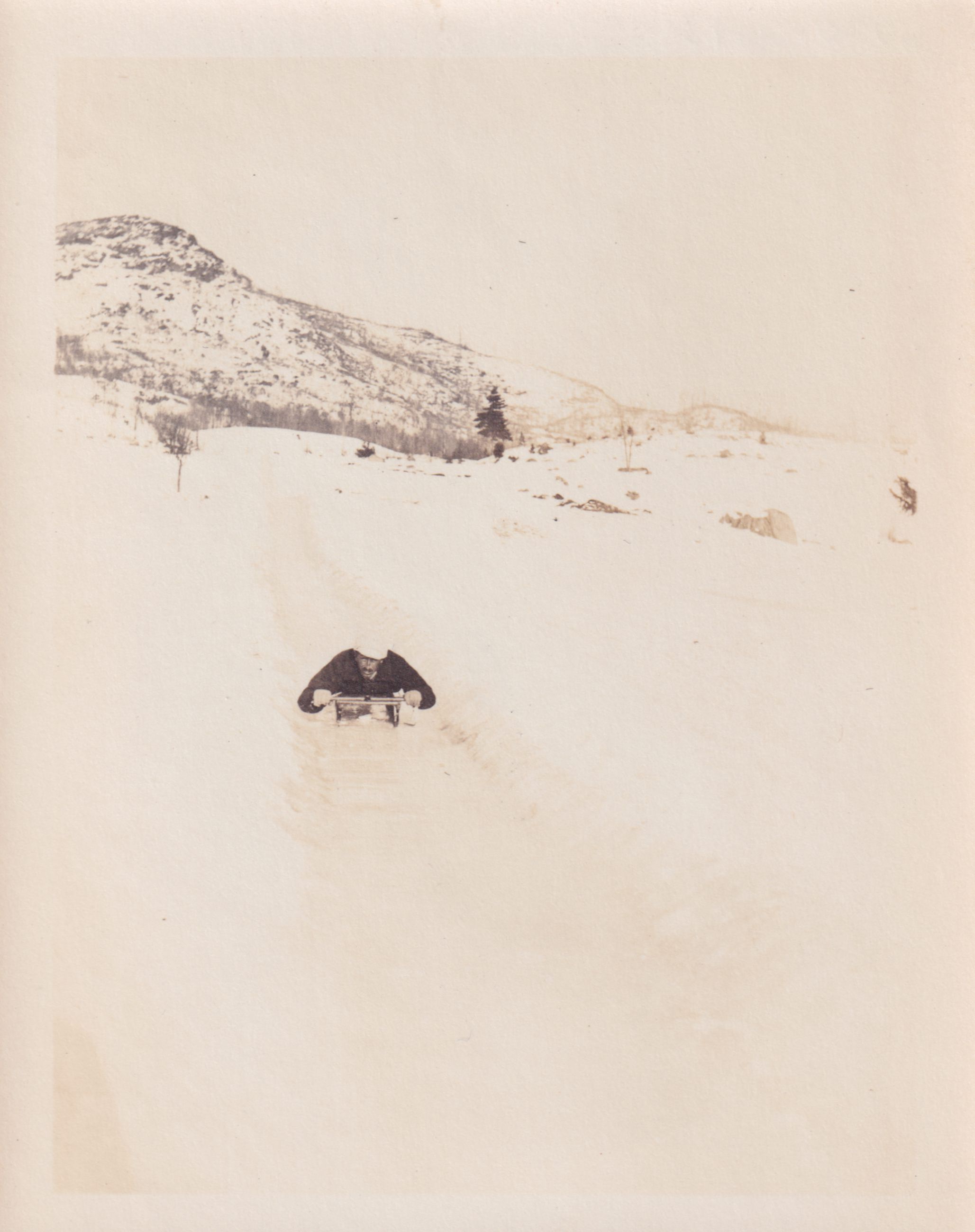 Photograph of an unidentified person riding a sled head-first down a hill. Mountains are visible in the background.