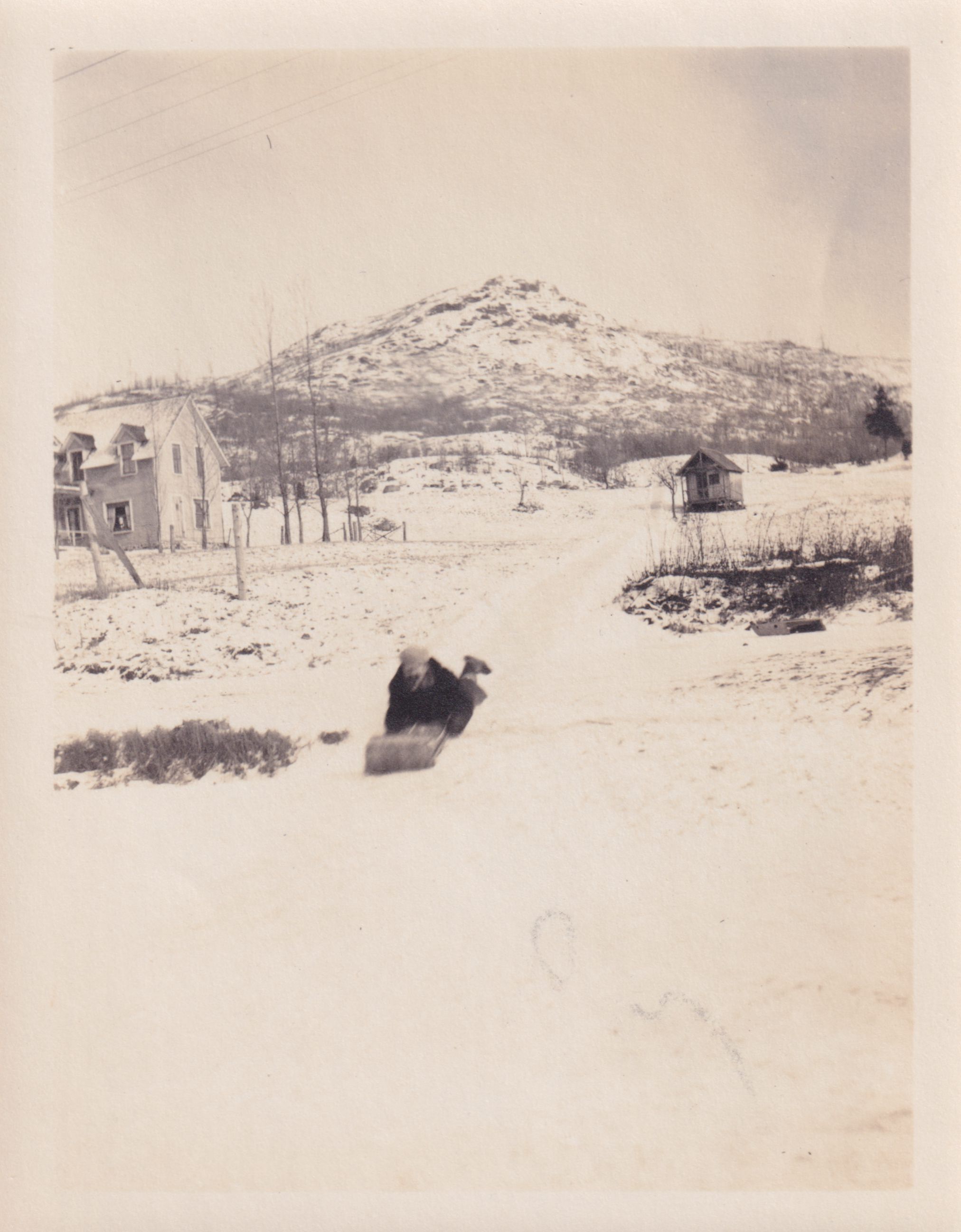 Photograph of an unidentified person riding a toboggan head-first down a hill onto the ice on Moody Pond.