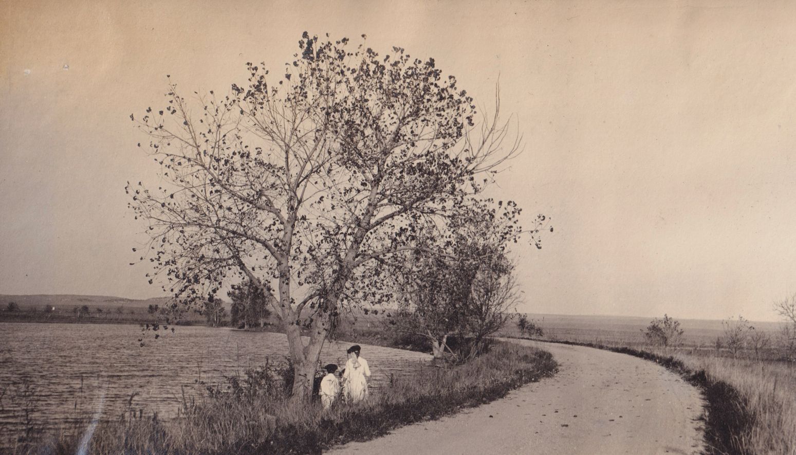 Black-and-white photograph of a woman and a young child standing underneath a tree on the side of a curved road. The road is curling around a lake or large pond.