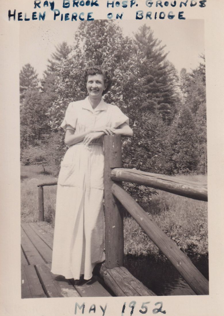 Black-and-White photograph of a woman standing on a bridge on the grounds at the New York State Hospital for Incipient Tuberculosis. Handwritten caption on front reads, "Ray Brook Hosp. Grounds - Helen Pierce on Bridge."
