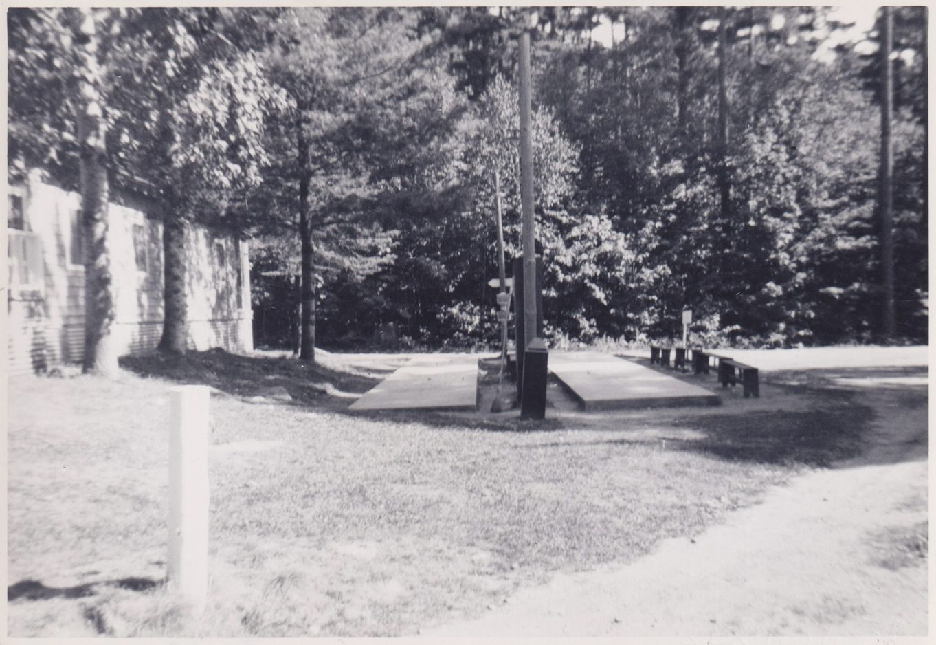Black-and-White photograph of the grounds at Pyramid Camp (AKA Bartlett Carry Camp). Two shuffleboard (or other game) courts can be seen with benches alongside them. Handwritten note on reverse reads, "53."