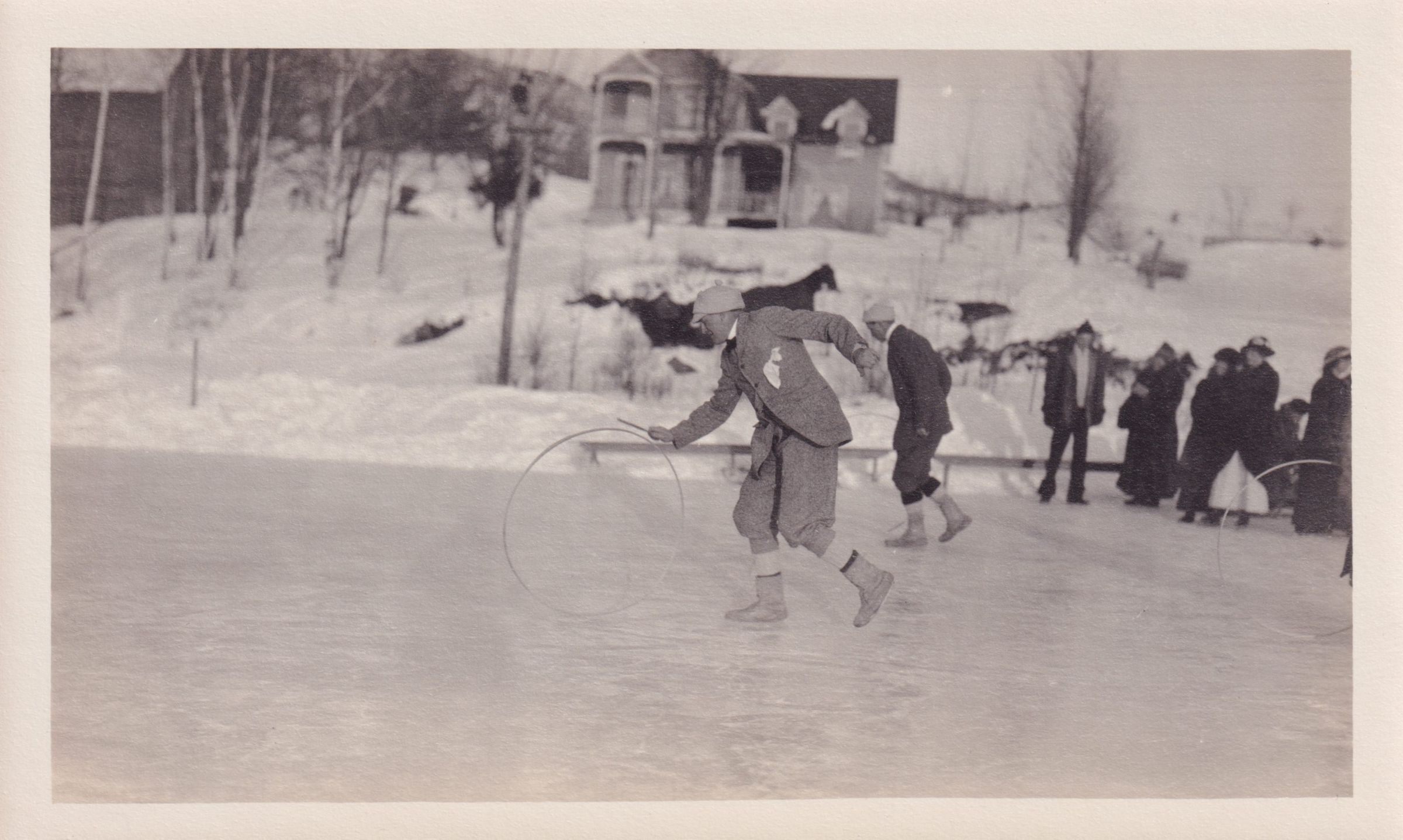 Photograph of two men hoop rolling/hoop trundling across the ice on Moody Pond. Spectators are visible to the right.