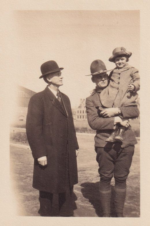 Black-and-White photograph of two men and a small child. One man is wearing a military or trooper uniform and holding the child on his shoulder. Was in a Kollecker Kodak and Gift Shop envelope. Photograph was developed by Kollecker's Kodak and Gift Shop.