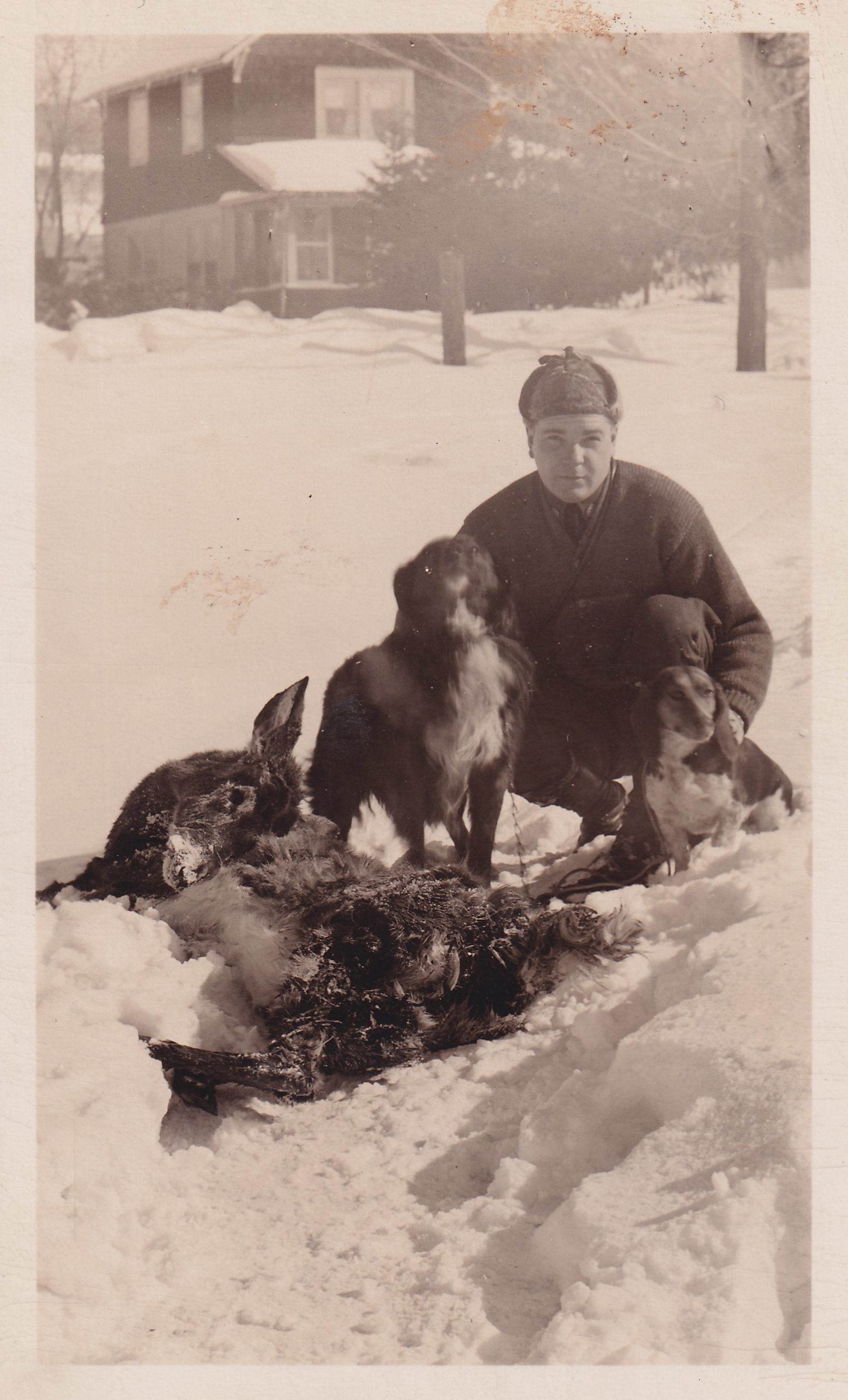 Black-and-White photograph of a man kneeling in the snow next to a dead deer. He has two hunting dogs with him. Handwritten caption on back reads, "February 17, 1945."