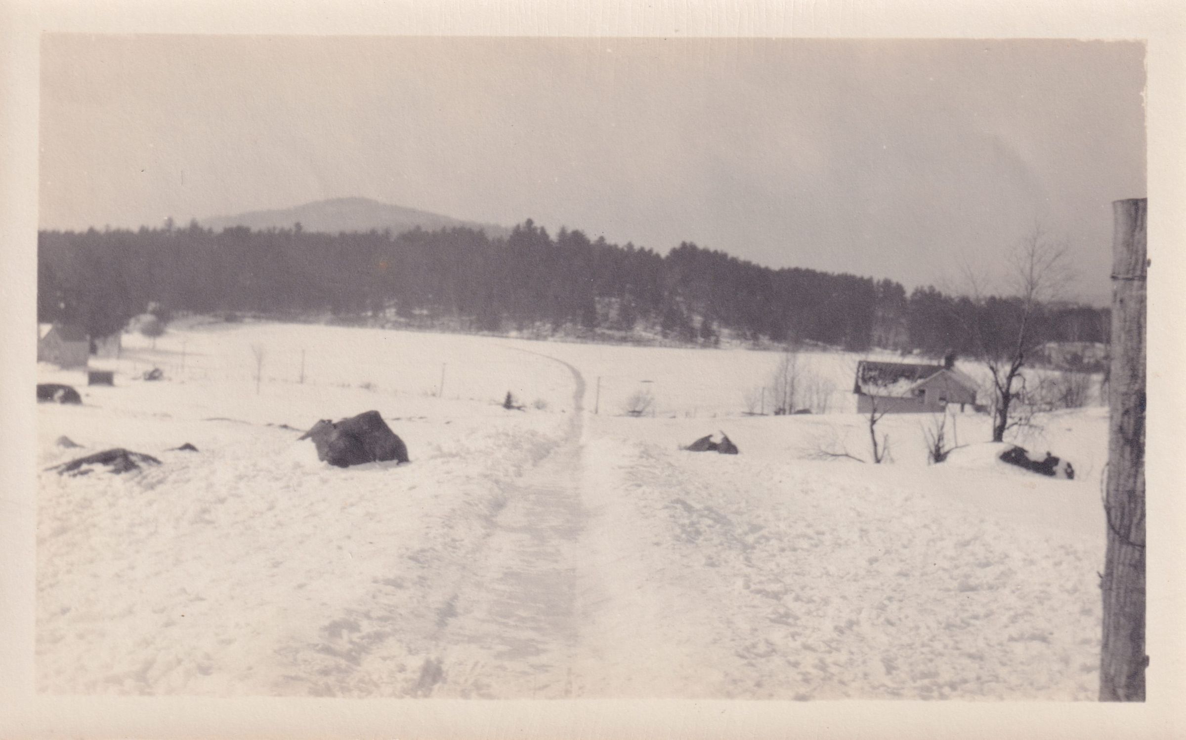 Photograph of the view down a snowy sled path on a hill looking down toward Moody Pond.