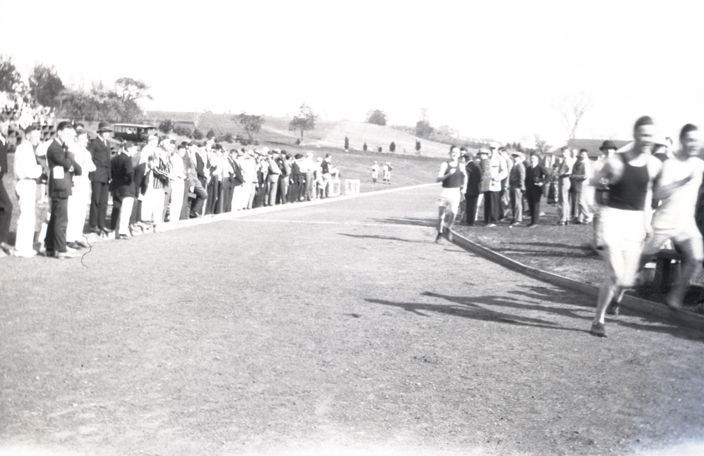 Negative of an outdoor track of cross country race. Three blurry racers are running on a dirt track between two crowds of spectators standing on the sidelines. Most likely taken by Mary Ives Baldwin. This item is not fully cataloged but has been uploaded so the image is publicly available; if you would like us to prioritize cataloging this item, please contact the HSL Collections team.