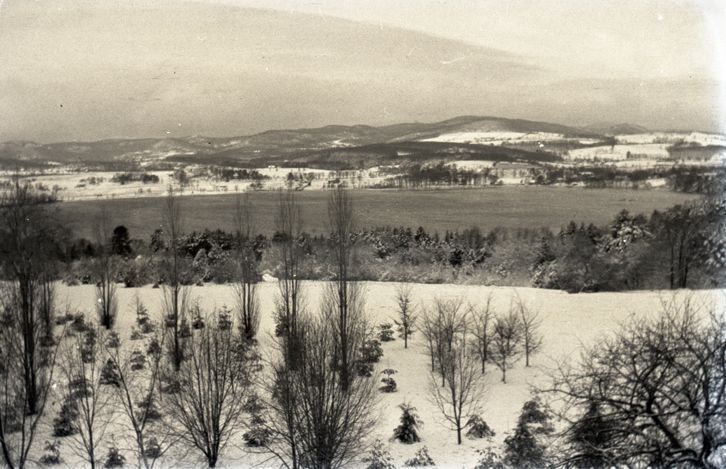 Negative of a winter view, with snow covering the ground and trees bare of leaves. There is a body of water in the distance, it does not appear to be frozen over. Most likely taken by Mary Ives Baldwin. This item is not fully cataloged but has been uploaded so the image is publicly available; if you would like us to prioritize cataloging this item, please contact the HSL Collections team.