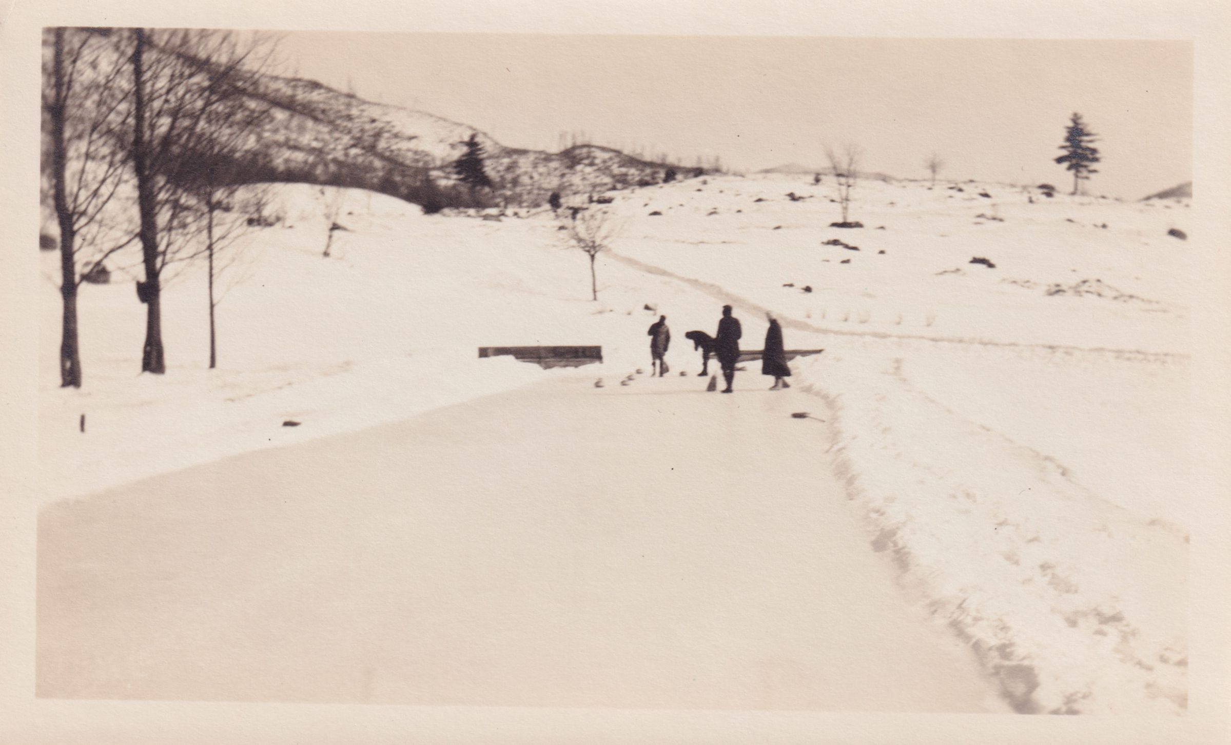 Photograph of the curling pitch on Moody Pond. Several people are visible at the far end.