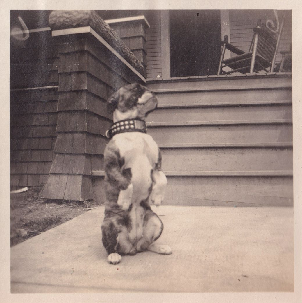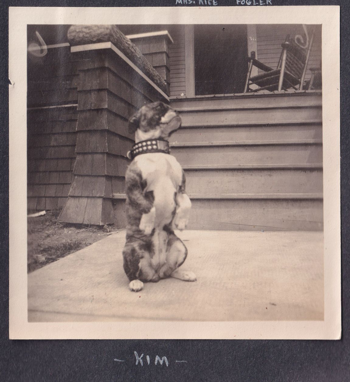 Black and white photograph of a dog sitting on its hind legs on the sidewalk leading up to a house. Beneath the photo there is the caption, "Kim."