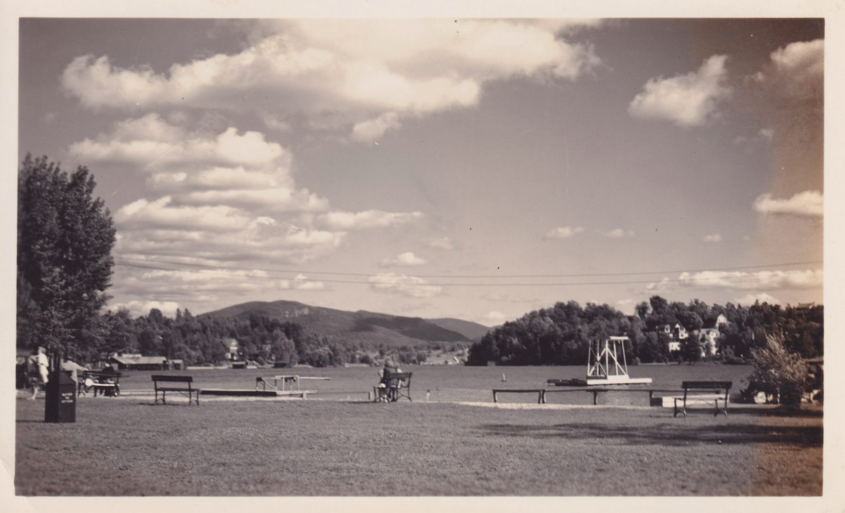 Black-and-White photograph of the public swimming beach on Lake Flower. Several people can be seen in the park. Photograph was likely printed by Kollecker's Kodak and Gift Shop.