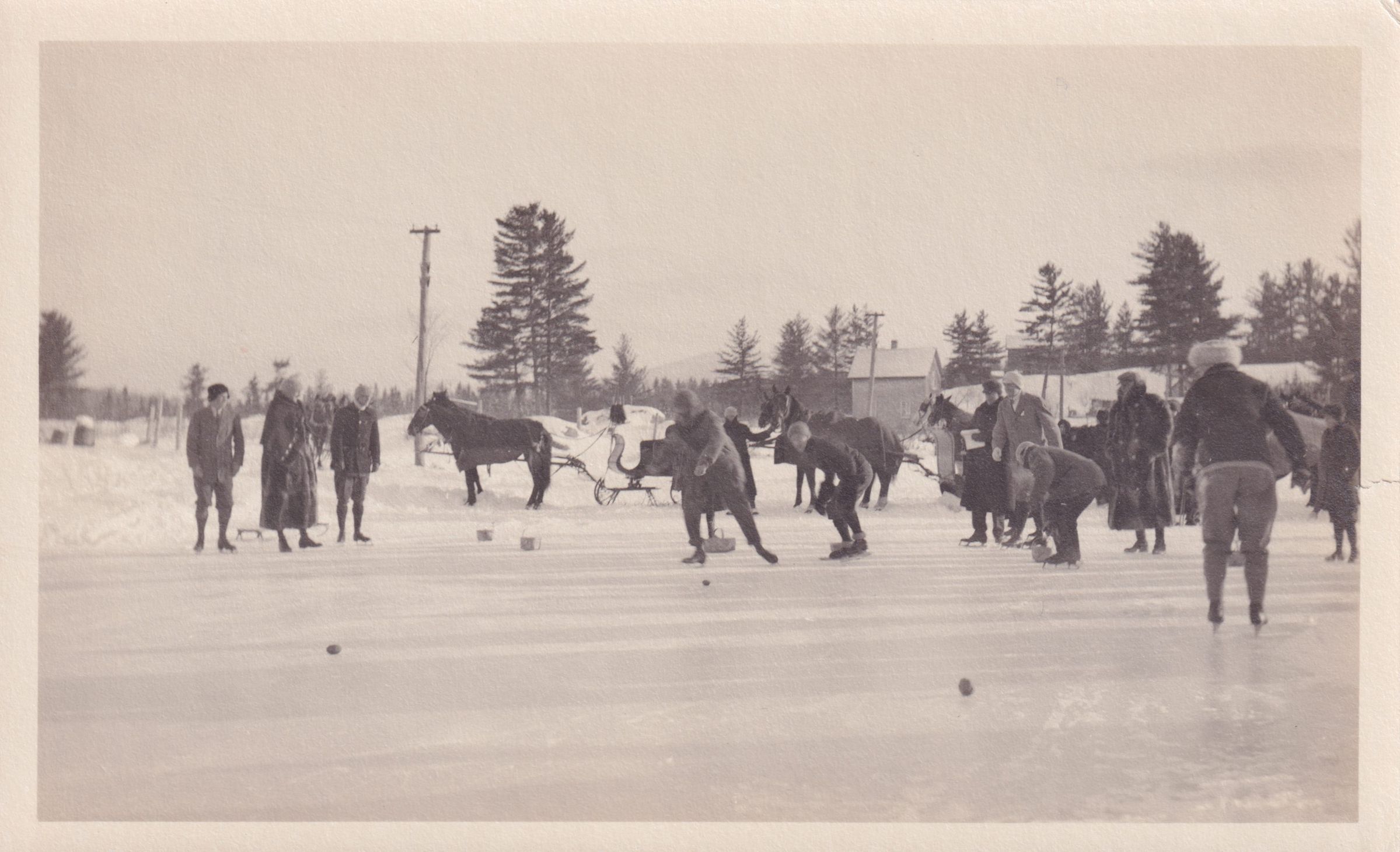 Photograph of people taking part in ice skating races on Moody Pond. There are round objects on the ice ahead of the racers. Spectators and a horse-drawn sleigh are visible in the background.