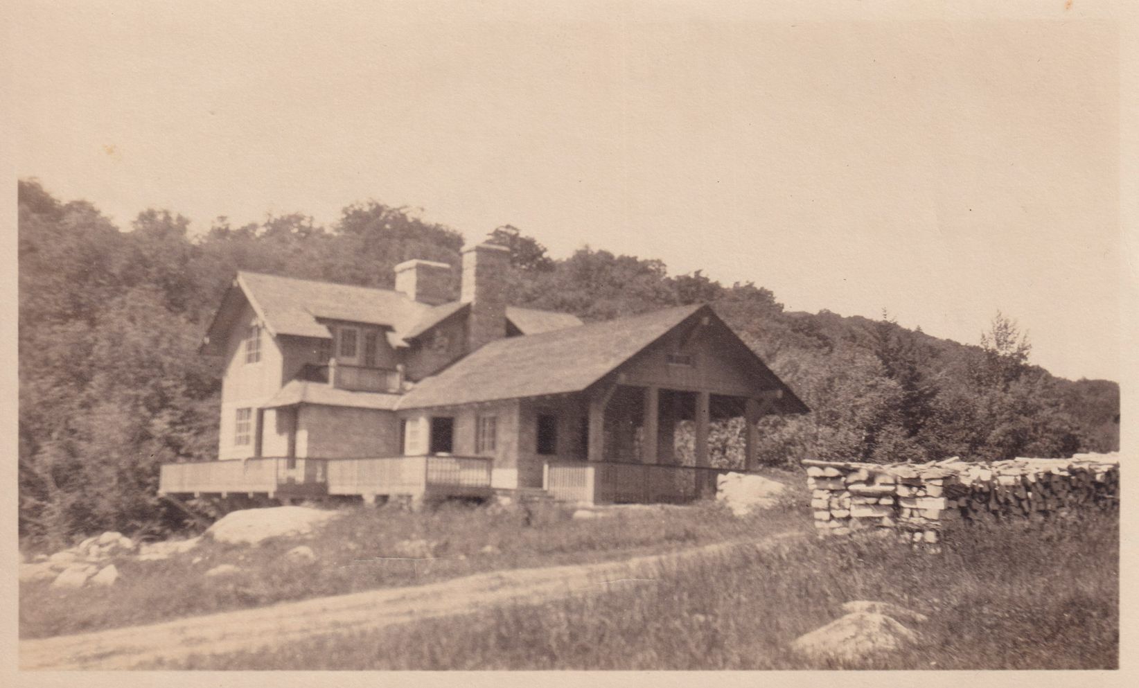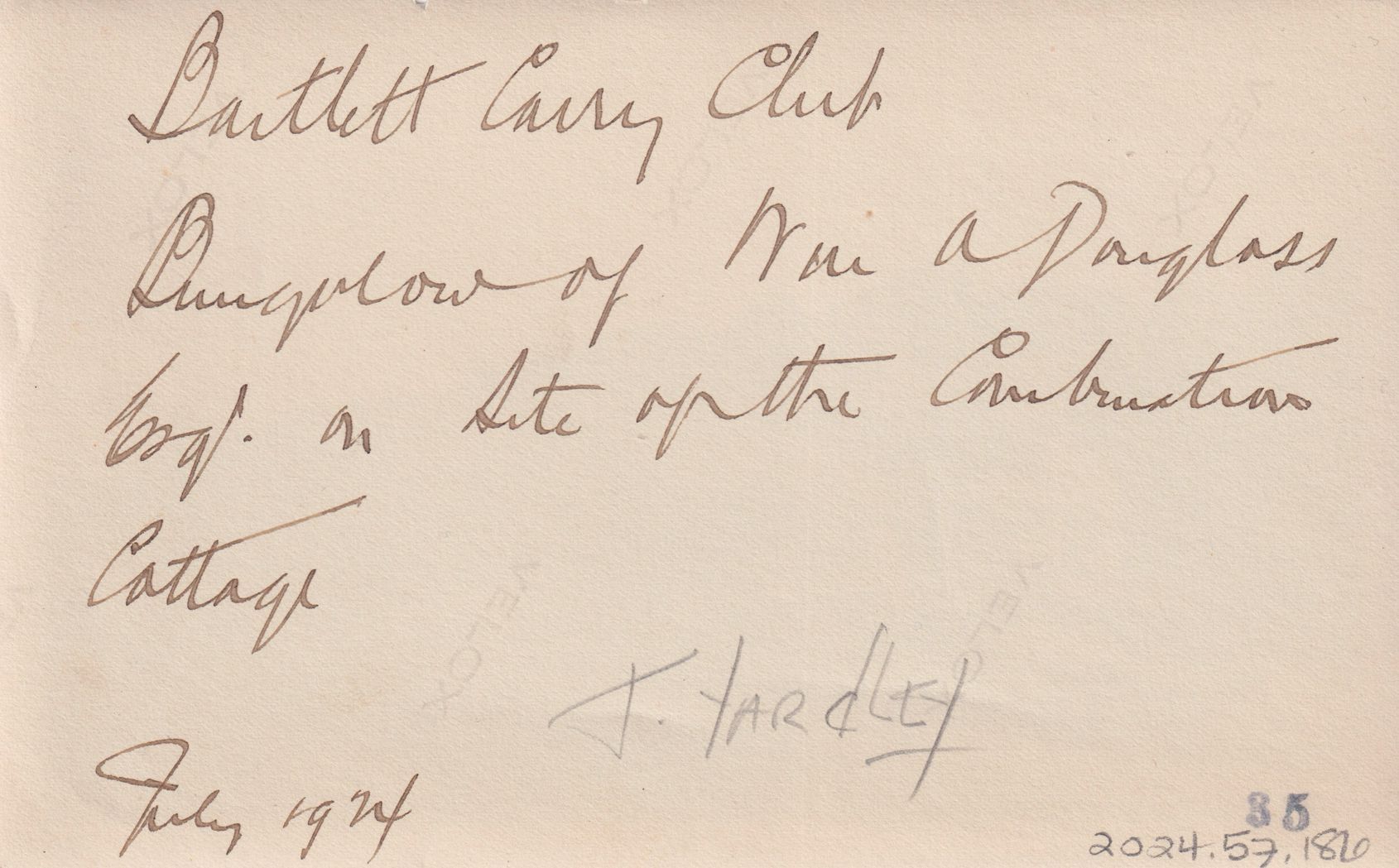 Black-and-White photograph of Douglass Cottage at Bartlett Carry Club. Handwritten note on reverse reads, "Bartlett Carry Club. Bungalow of Wm. A. Douglass Esq. on site of the Combination Cottage. July 1924."