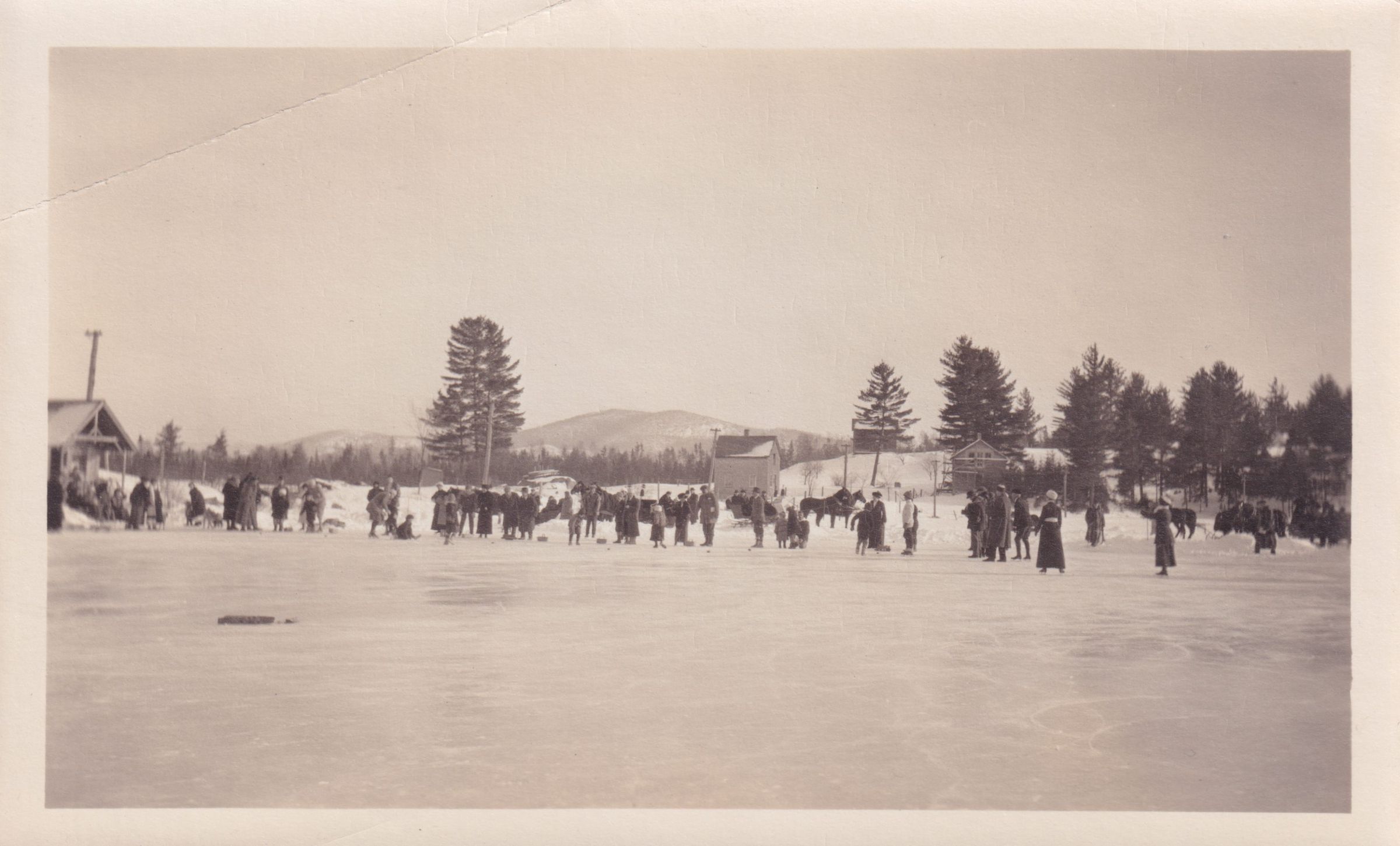 Black-and-White photograph from a distance of people skating on Moody Pond.