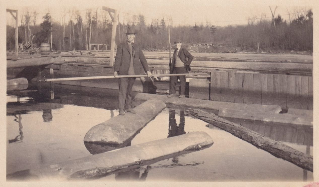 Black-and-White photograph of two loggers standing on logs floating in a river. They are both holding long poles. The photograph was likely printed by Kollecker's Kodak and Gift Shop.