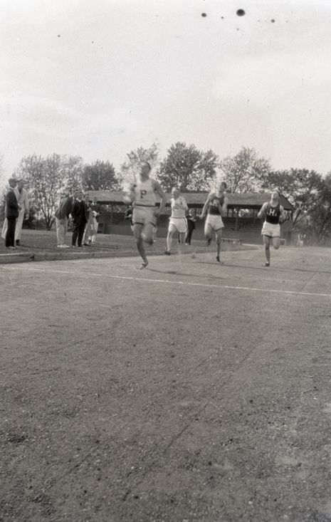 Negative of an outdoor track race. There are four blurry runners racing on the dirt track. Two are wearing tops with the letter "P" on them, while the other two's tops have "H"s. Most likely taken by Henry Ives Baldwin. This item is not fully cataloged but has been uploaded so the image is publicly available; if you would like us to prioritize cataloging this item, please contact the HSL Collections team.
