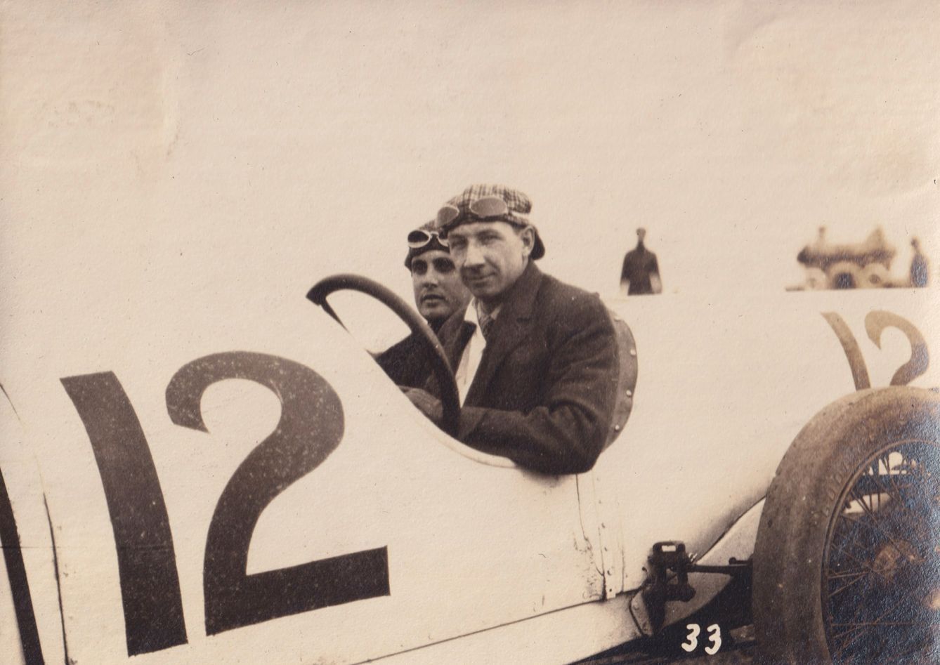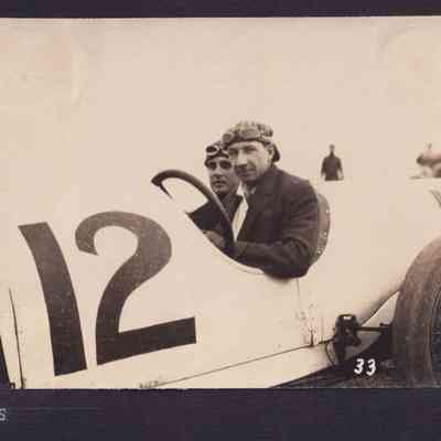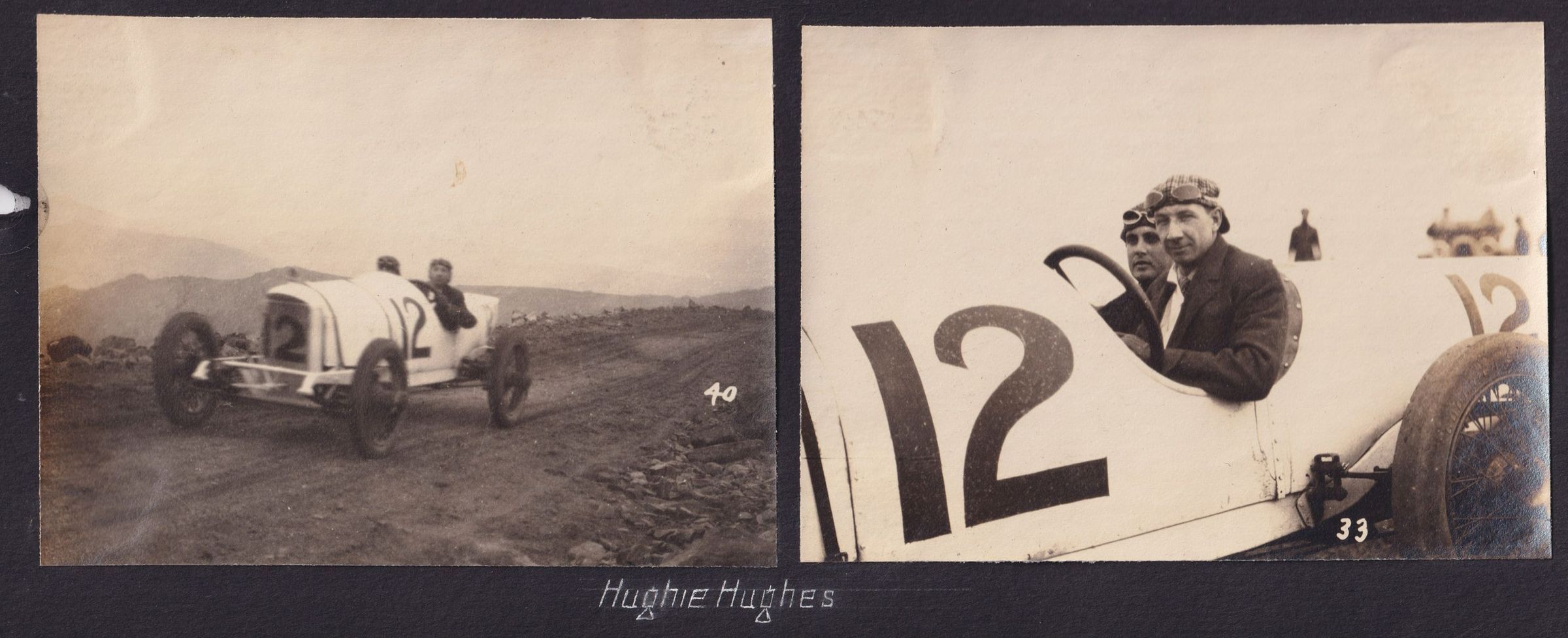Black-and-white photograph of a white car with two men in the seat. The car has the number 12 painted on the side. "Hughie Hughes" is written in white ink beneath the photograph.