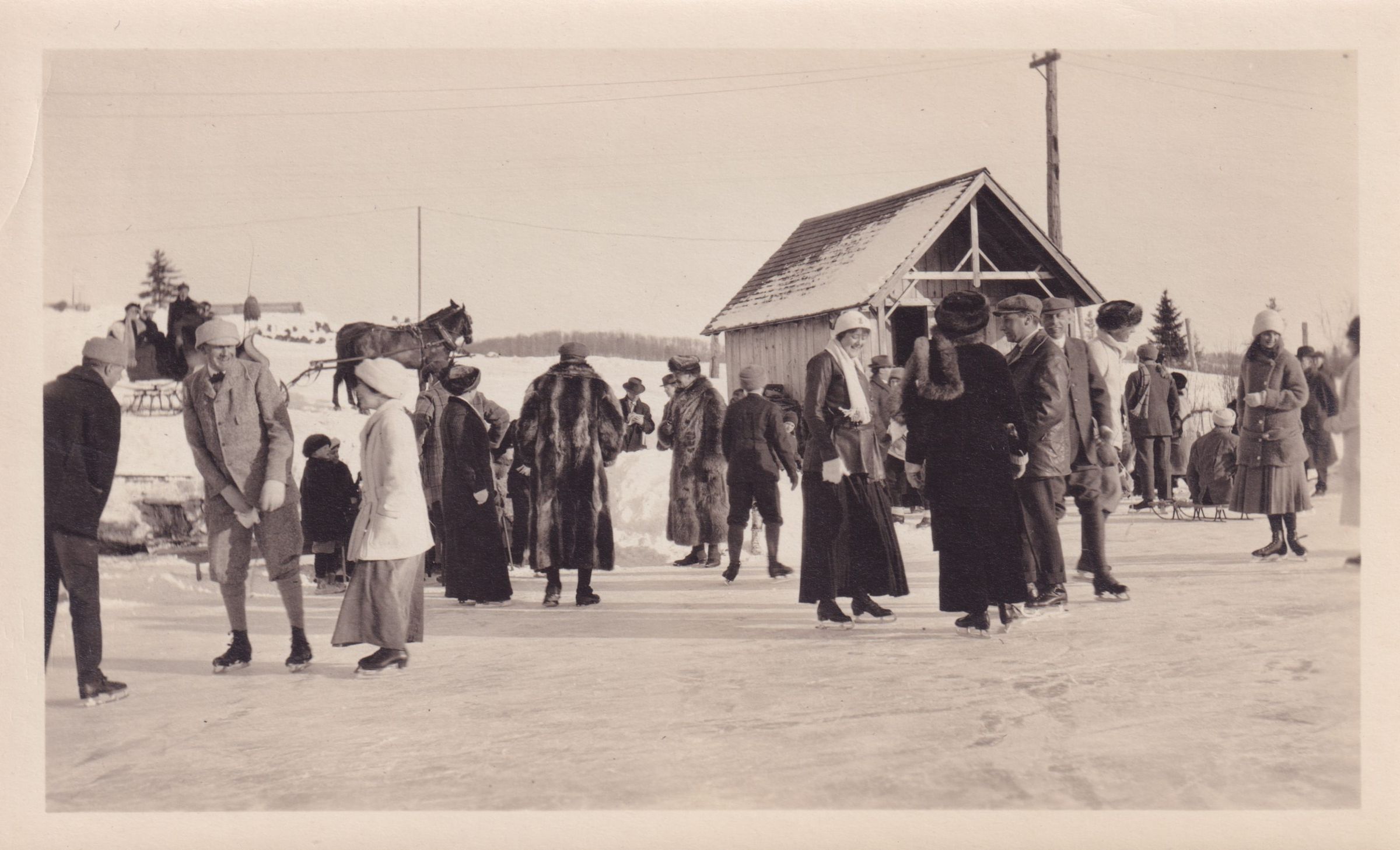 Photograph of people standing on the ice on Moody Pond. Some are wearing ice skates. A small hut, possibly a warming or changing hut, is visible behind them.