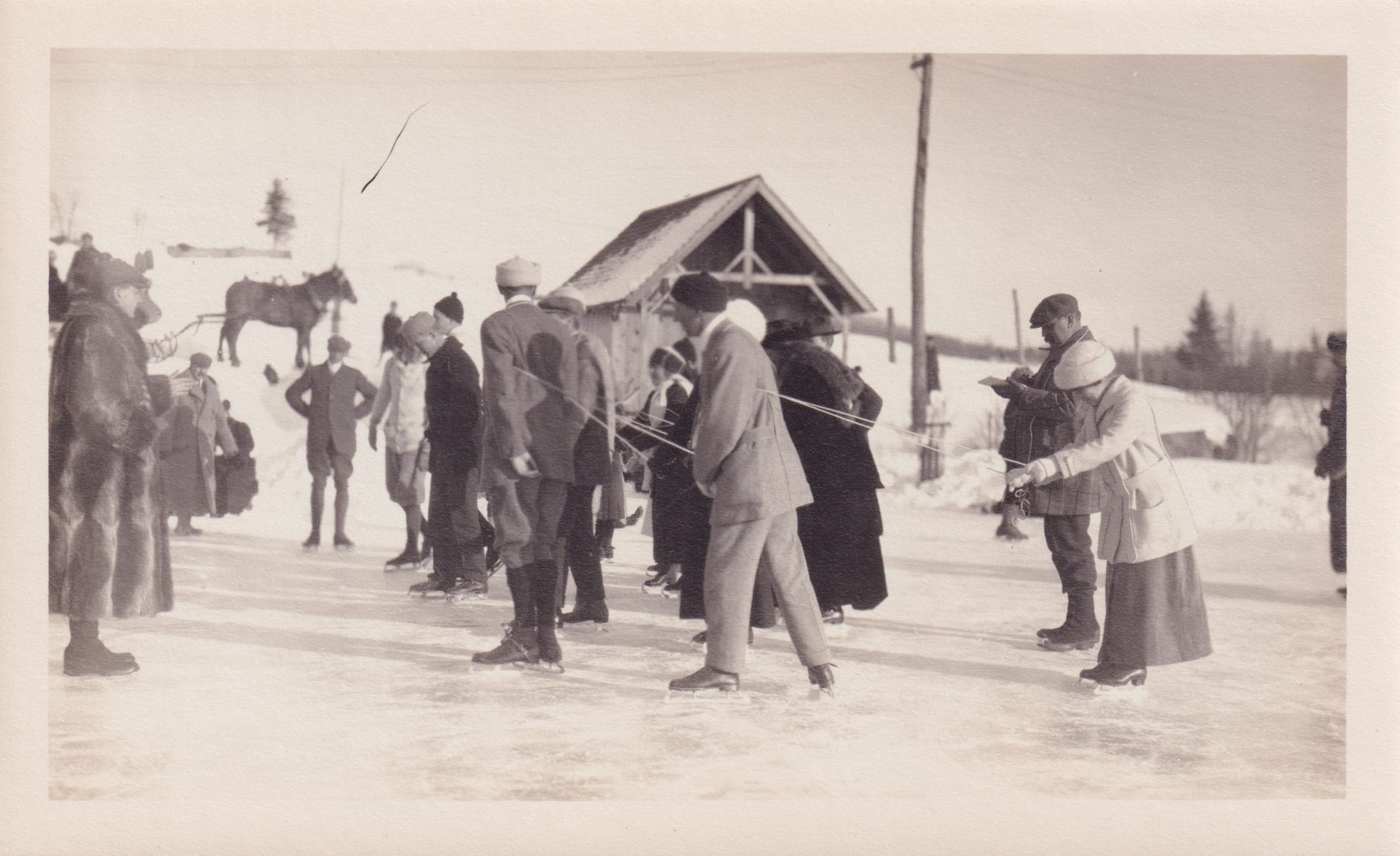 Photograph of people towing each other while racing on ice skates on Moody Pond.