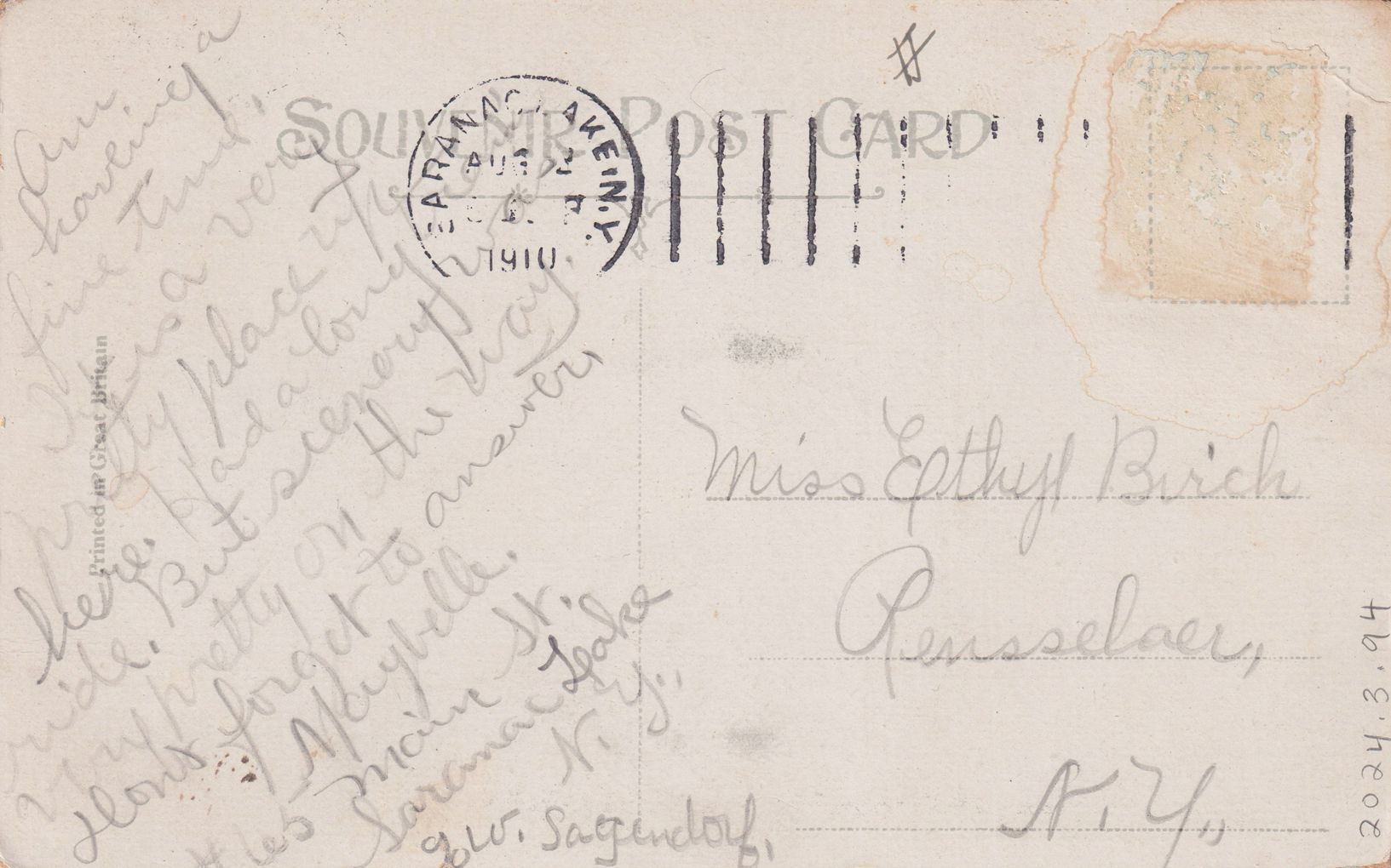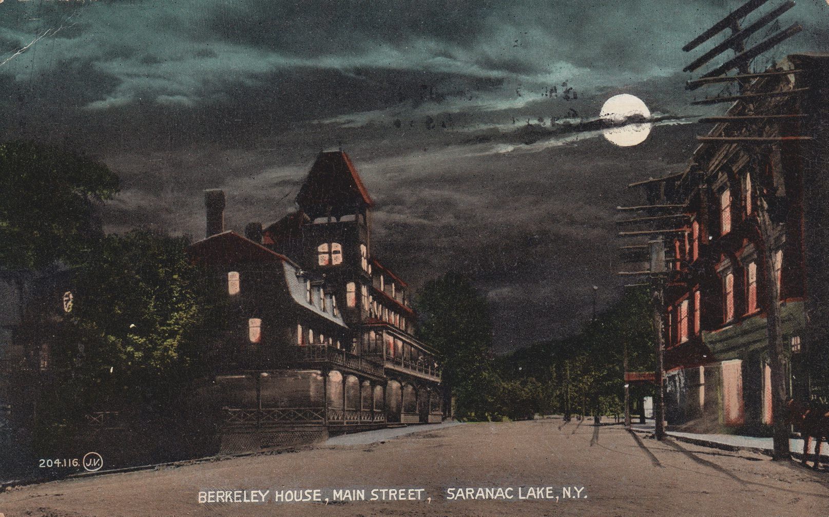 Color postcard showing the intersection of Main Street and Church Street under the moonlight. The Berkeley House is visible at left, and Leonard's Department Store and the Harding Block at right. Printed caption on front reads, "Berkeley House, Main Street, Saranac Lake, N. Y." No printer's mark. Used, divided back, postmarked Saranac Lake, August 2, 1910. Handwritten message on reverse reads, "Am having a fine time. It is a very pretty place up here. Had a long train ride. But scenery was very pretty on the way. Don't forget to answer. Maybelle. 65 Main Street, Saranac Lake, N. Y. c/o W. Sagendorf." Mailed to Miss Ethyl Birch, Rensselaer, N.Y.Subject Place