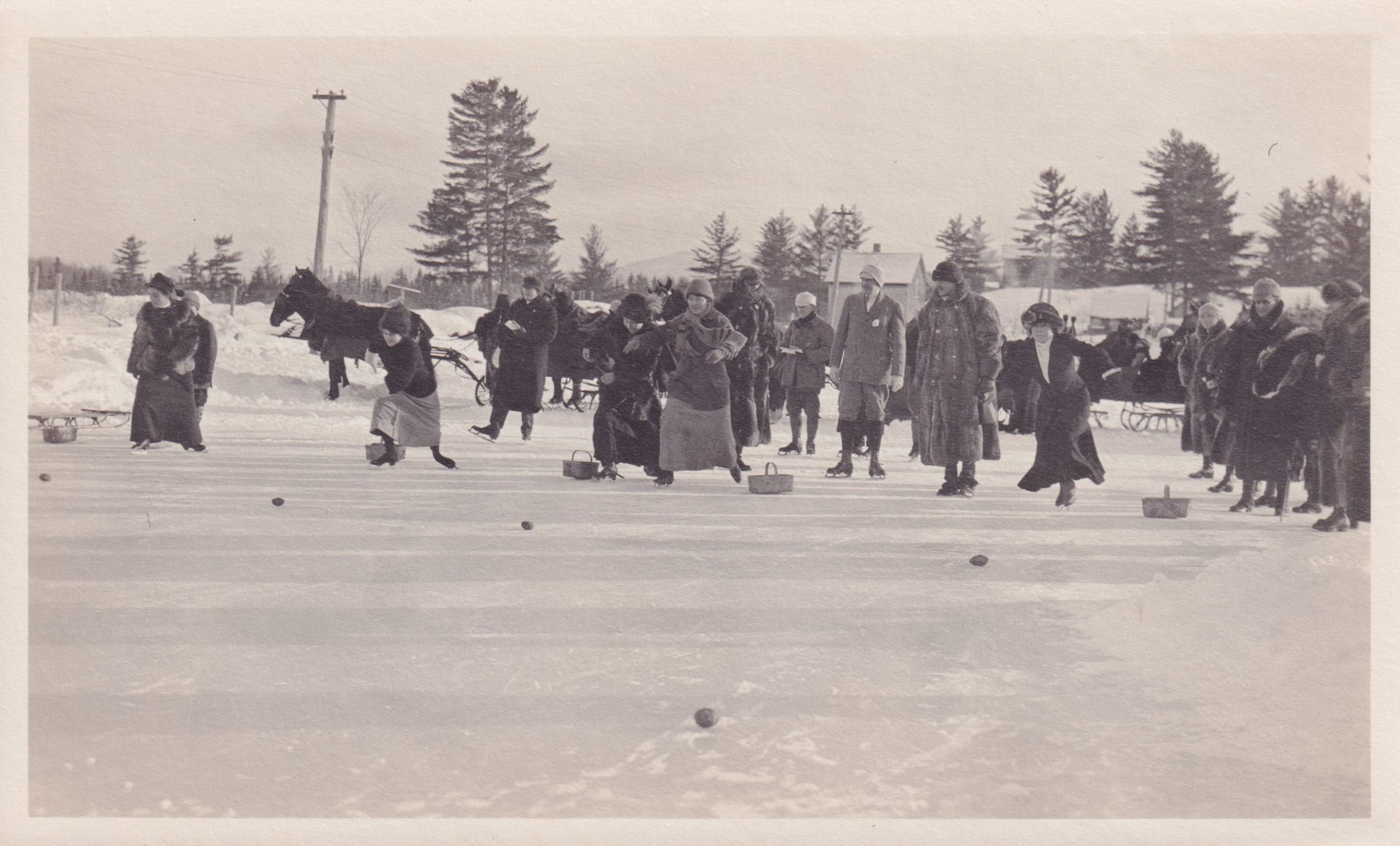 Photograph of people taking part in ice skating races on Moody Pond. There are round objects on the ice ahead of the racers. Spectators are visible in the background.