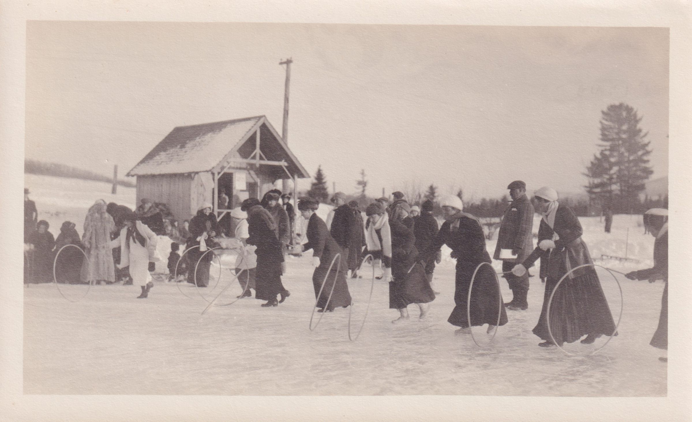 Photograph of a group of people hoop rolling/hoop trundling across the ice on Moody Pond. Spectators are visible in the background.