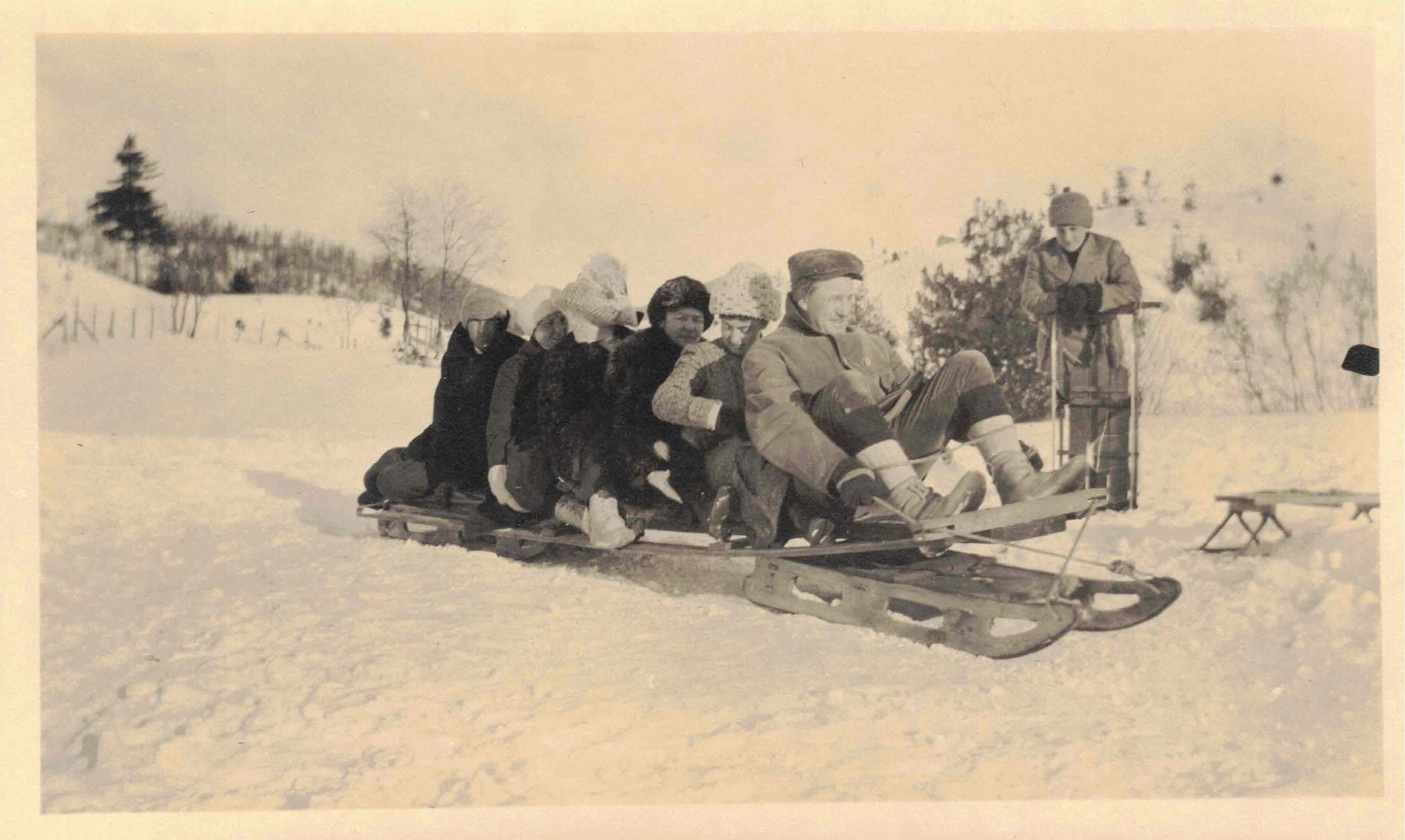 Photograph of a group of six men and women seated on a sled. There is a child standing with a smaller sled behind them. Fletcher McCullough Durbin is seated at the left at the end of the sled, and Hazel Durbin is seated third from left with a scarf covering her face.