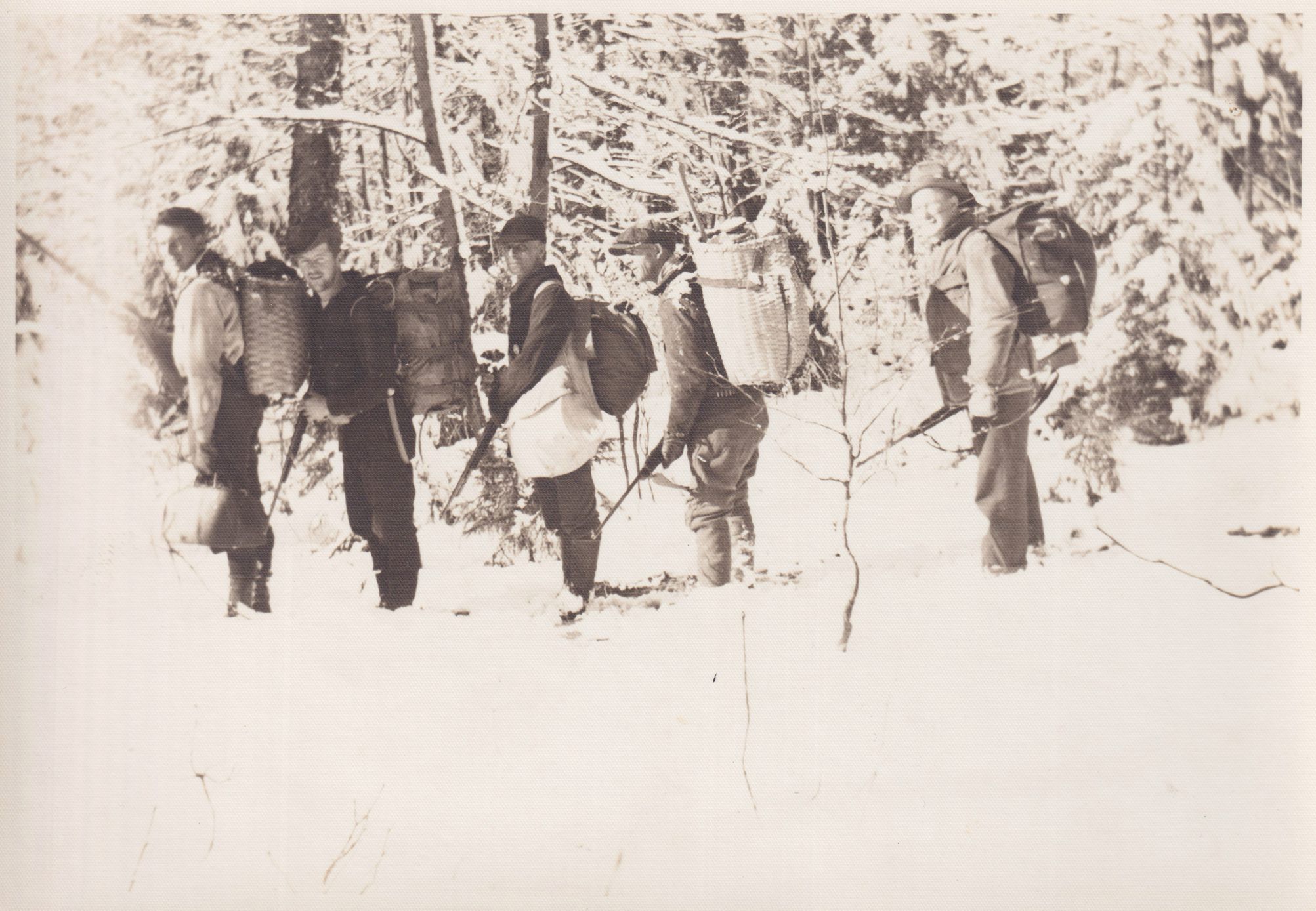 Black-and-White photograph of a line of unidentified hunters/guides standing in the snow. Two of them are wearing pack baskets. The location of this photograph is unknown. Dated 1938.