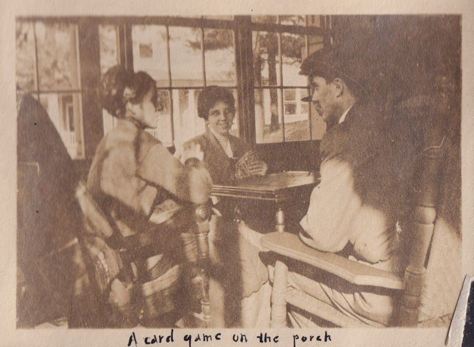 Black-and-white photograph of two women and one man sitting together around a table and playing a game with a deck of cards. The table and chairs are sitting on a porch with glass windows. "A card game on the porch" is written in ink beneath the photograph.