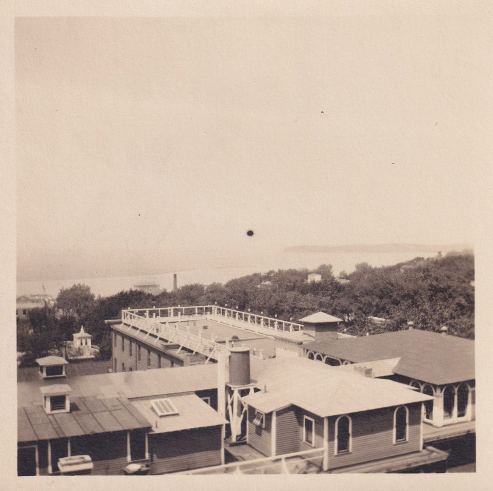 Black-and-White photograph of the roof of an unidentified building. A body of water can be seen in the distance. The photograph was likely printed by Kollecker's Kodak and Gift Shop.