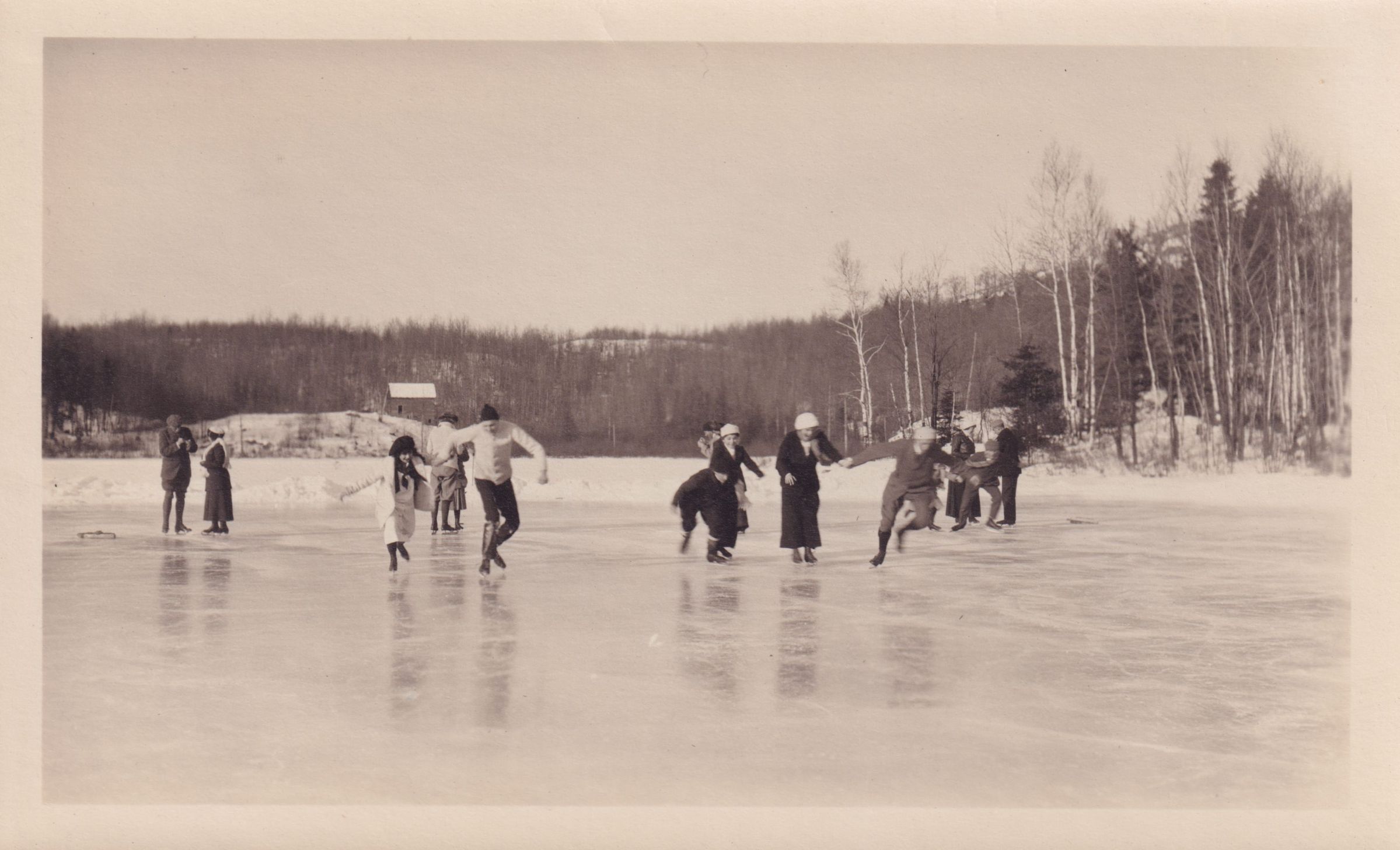 Photograph of pairs of skaters racing on the ice on Moody Pond.