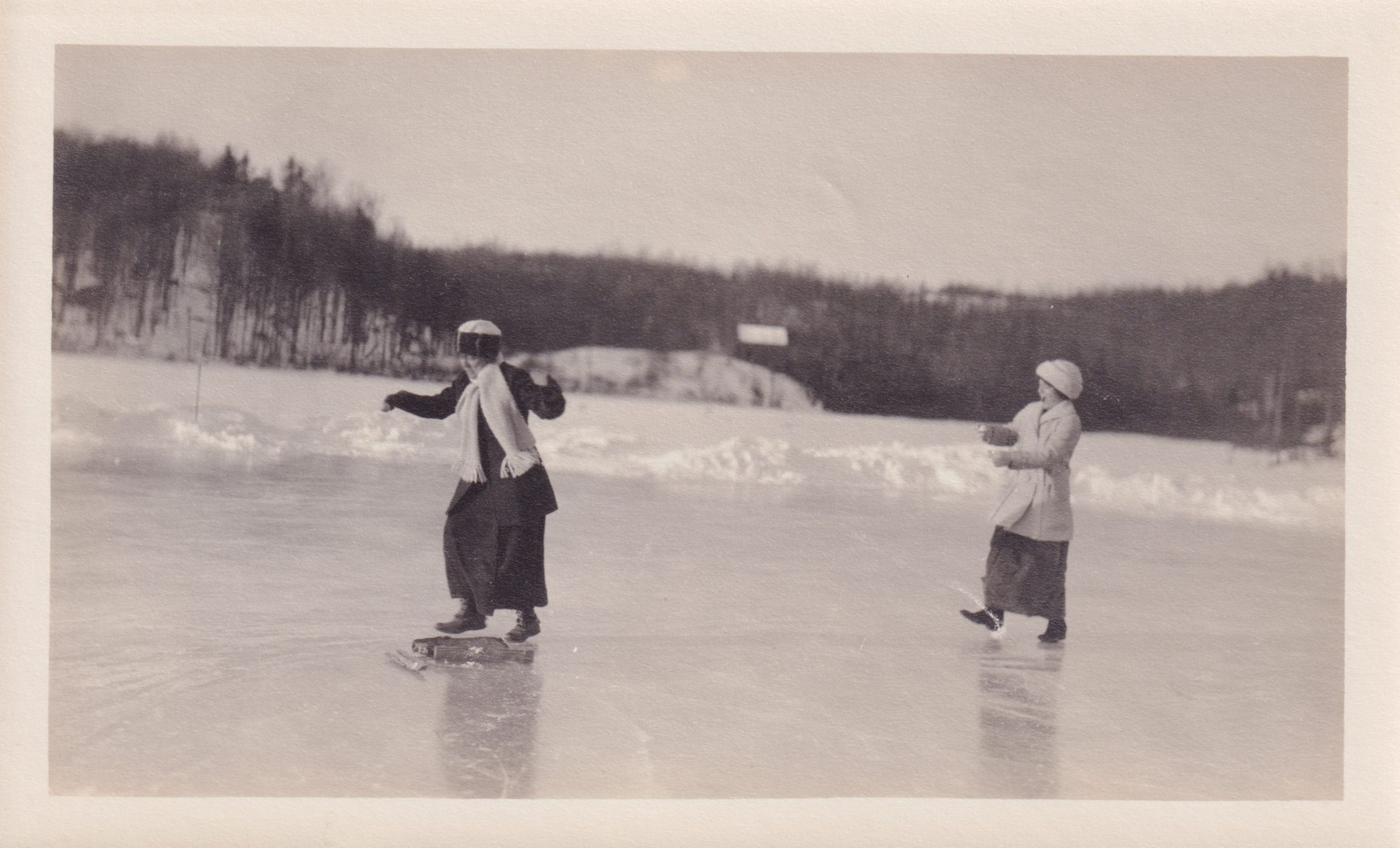 Photograph of two women balancing eggs on spoons while running in a race across the ice on Moody Pond.