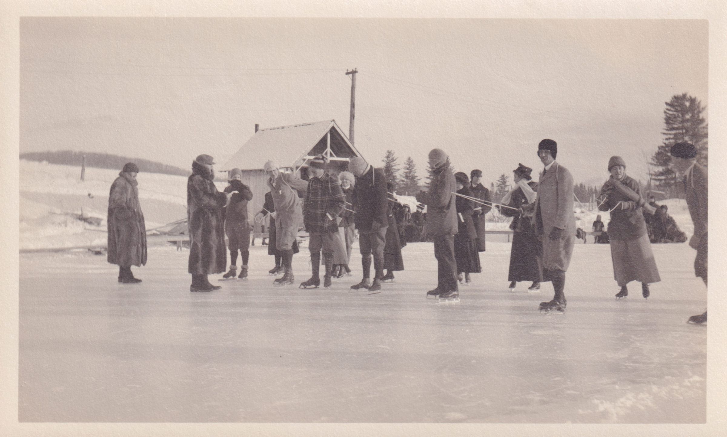 Photograph of group of people lined up for an ice skating tow race on Moody Pond.