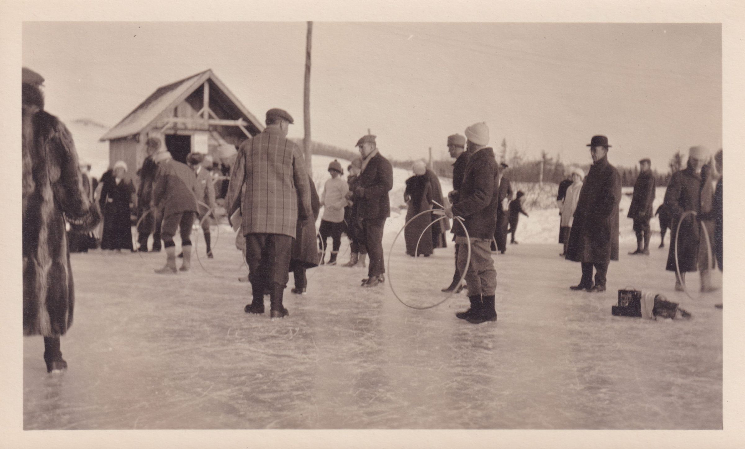 Photograph of a group of people lined up for a hoop rolling/hoop trundling race across the ice on Moody Pond.