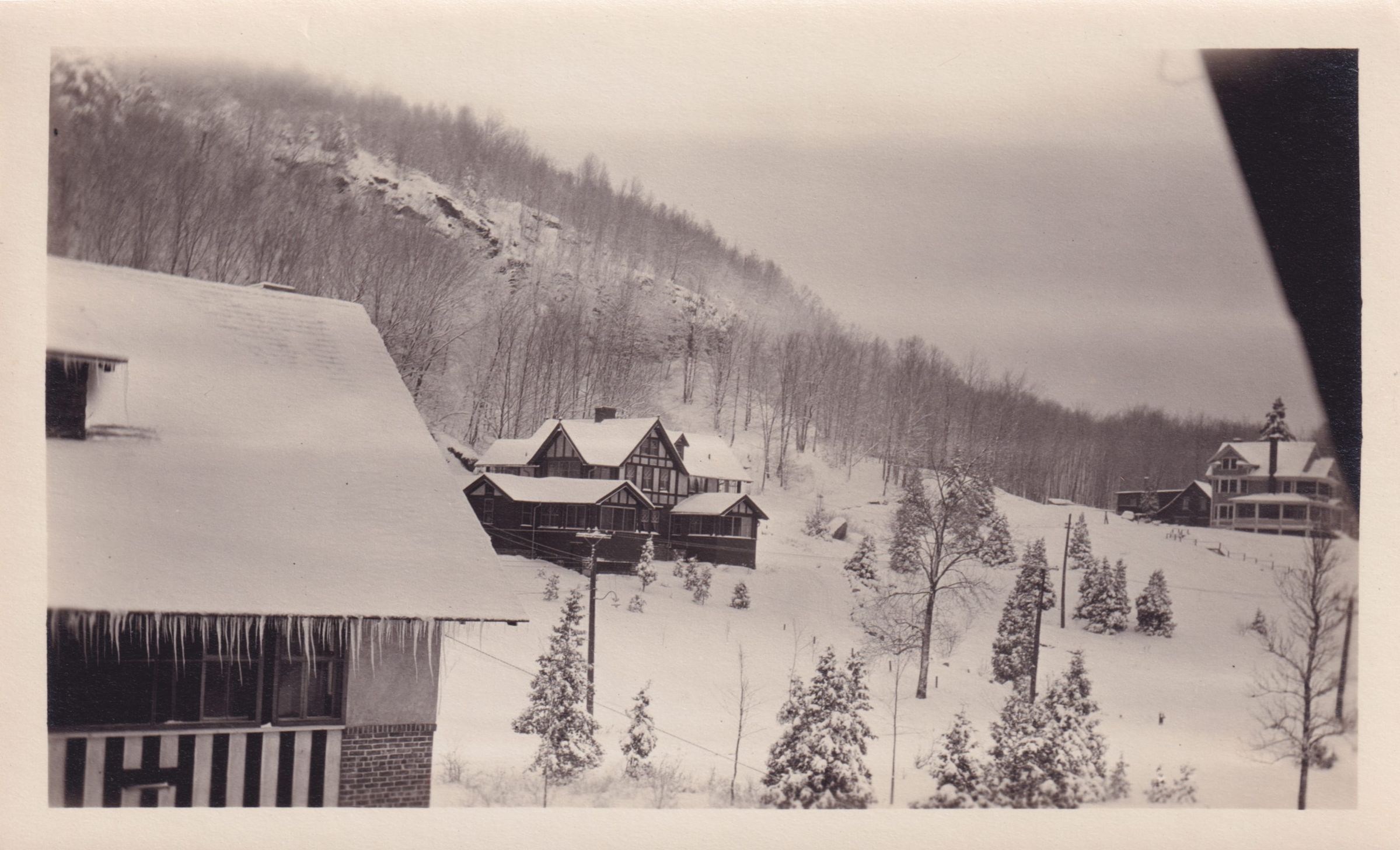 Photograph of the Williams Cottage/50 Baker Street [15 Cliff Road] and 106 1/2 Park Avenue [34 Cliff Road] in the snow. The photograph was taken from the back of a house on Park Avenue, and the back side of a house on Baker Street is visible at left.