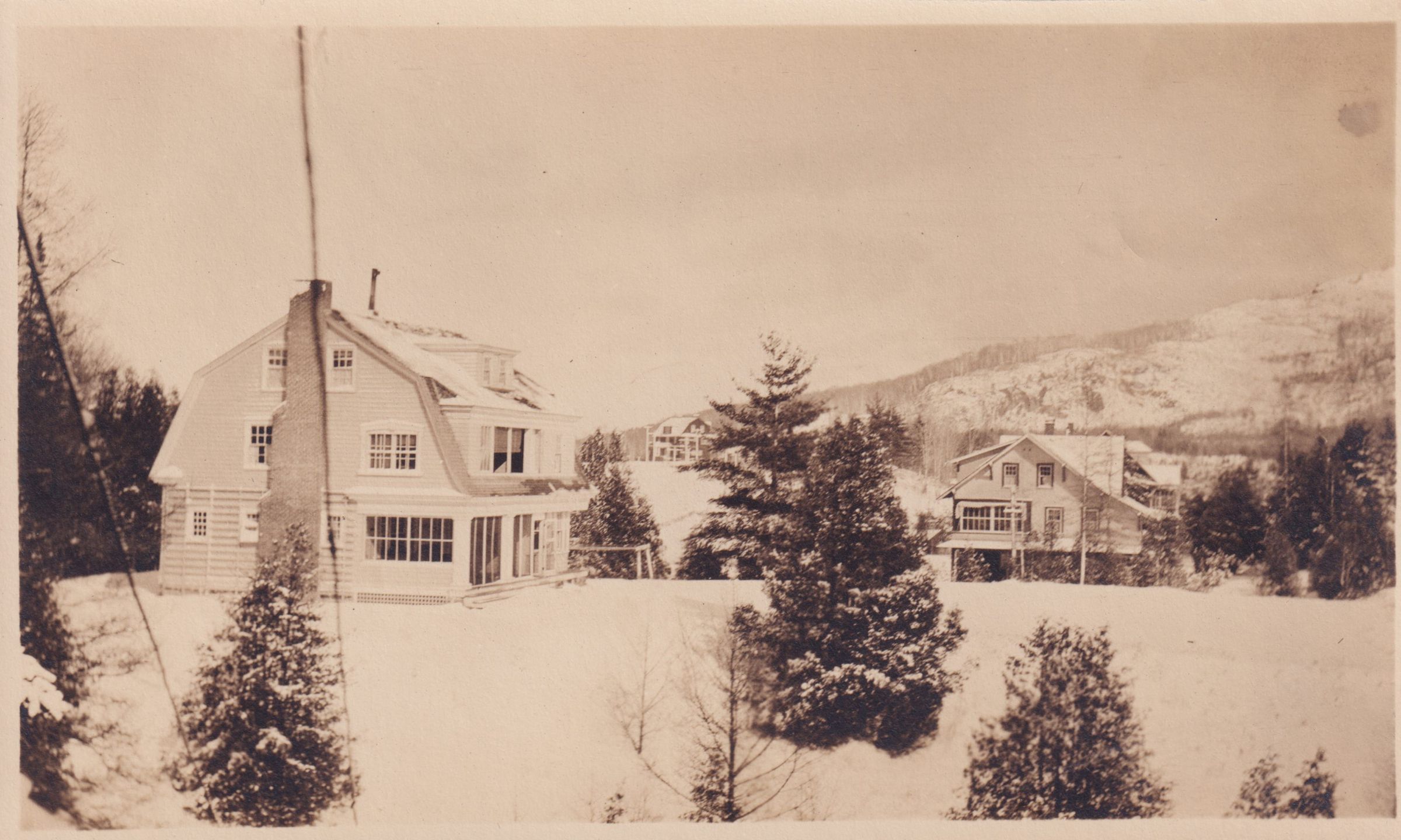 Photograph of the west and south sides of Cluett Cottage/103 Park Avenue [218 Park Avenue] and Burgess Cottage/107 Park Avenue [230 Park Avenue] in the snow. The photograph was taken from the Dr. A. H. Allen Cottage/22 Catherine Street [11 Woodycrest Road].