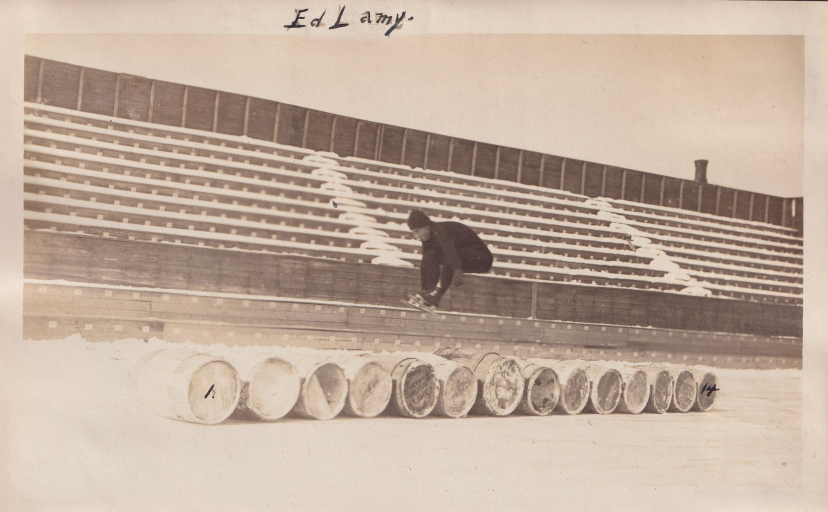 Black-and-white photograph of Ed Lamy in skating gear, jumping over fourteen barrels lying side-by-side on the ice. There are empty stands behind him. "Ed Lamy" is written in ink at the top of the photograph.