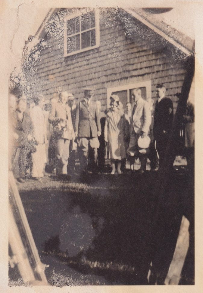 Black-and-White photograph of a group of people standing next to a building. President Calvin Coolidge and Grace Coolidge are standing to the left of center. An unidentified man in military uniform is standing next to Mrs. Coolidge. It appears that the negative the print was created from had sustained some damage. The photograph was likely printed by Kollecker's Kodak and Gift Shop.