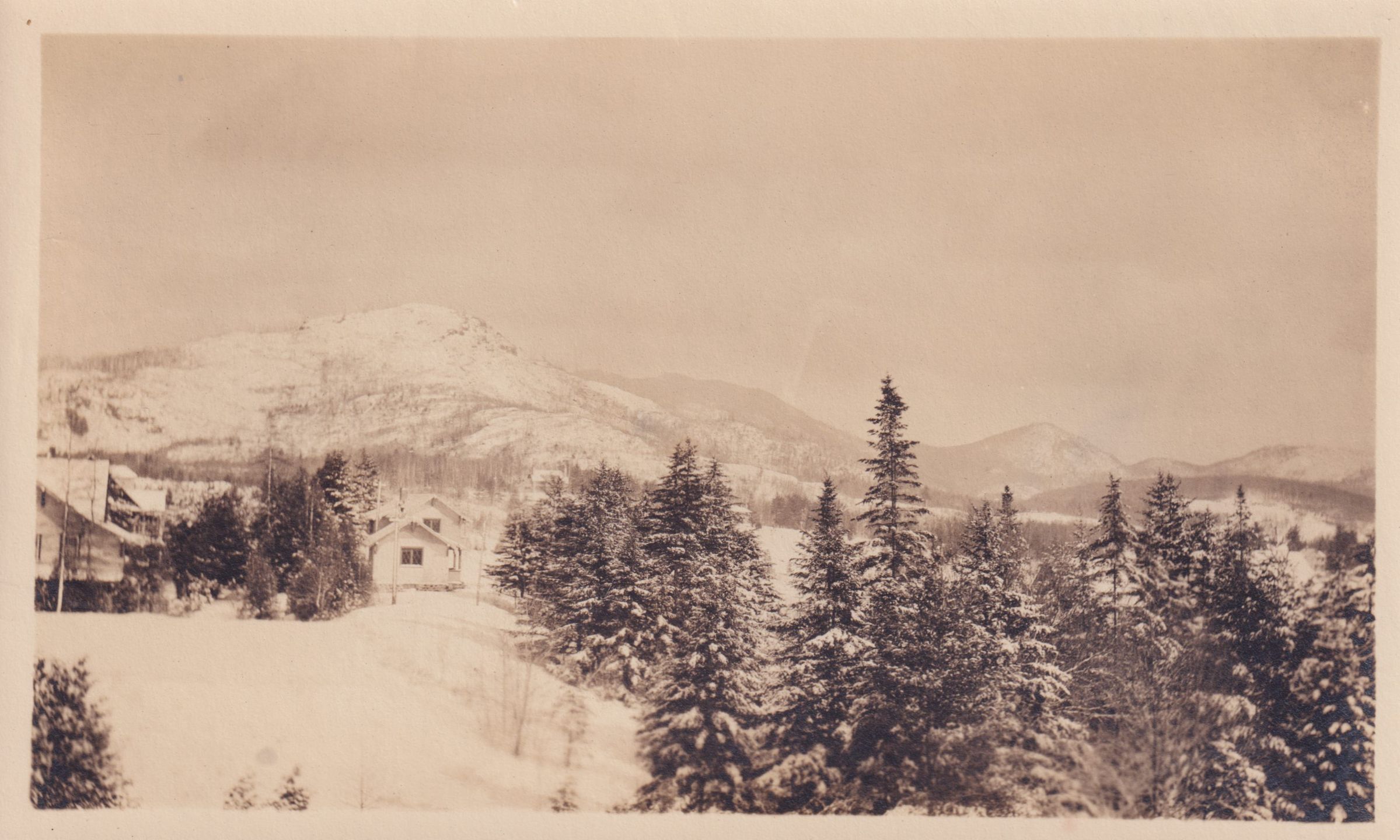Photograph of the view to the east from the Dr. A. H. Allen Cottage/22 Catherine Street [11 Woodycrest Road] in the winter. A building [21 Morris Way] is visible in the distance. Mt. Baker can be seen in the background. The same view in summertime can be seen in 2020.2.75.