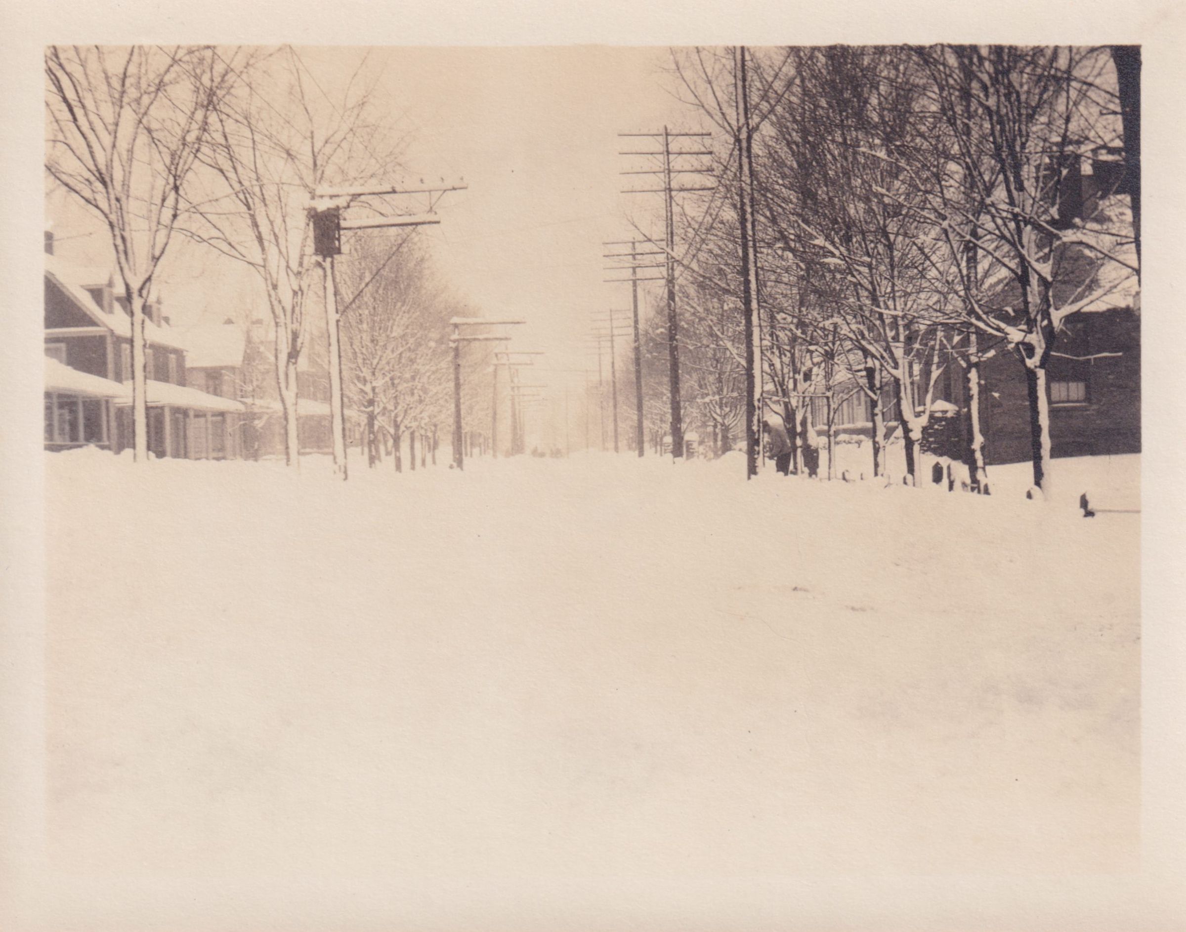 Photograph of a snowy view looking south down Church Street near the intersection with Main Street. The Saranac Laboratory is just visible at the right through the trees.