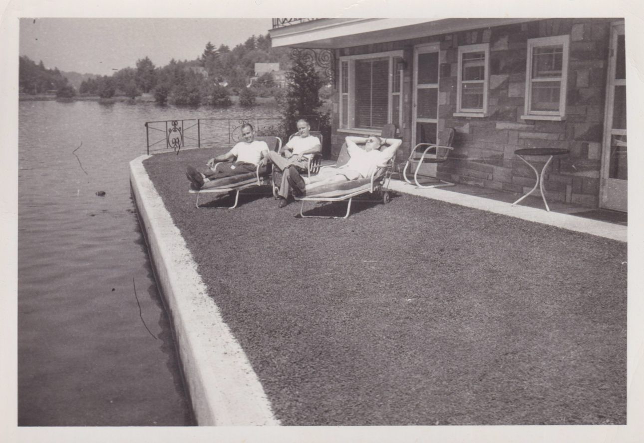 Black-and-White photograph of four unidentified men seated on lounge chairs along a body of water, probably at Gauthier's Motel on Lake Flower.