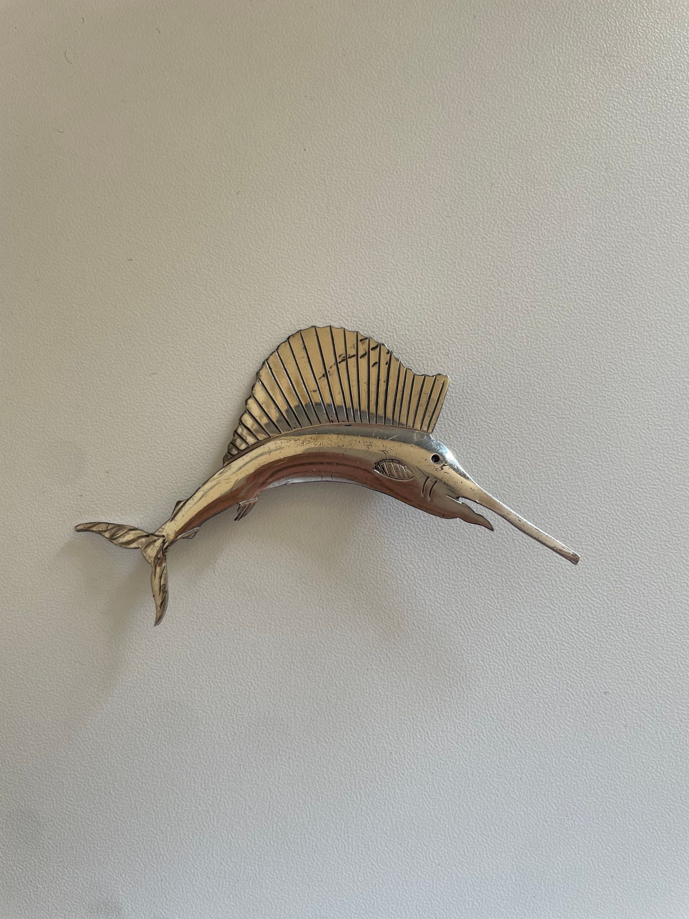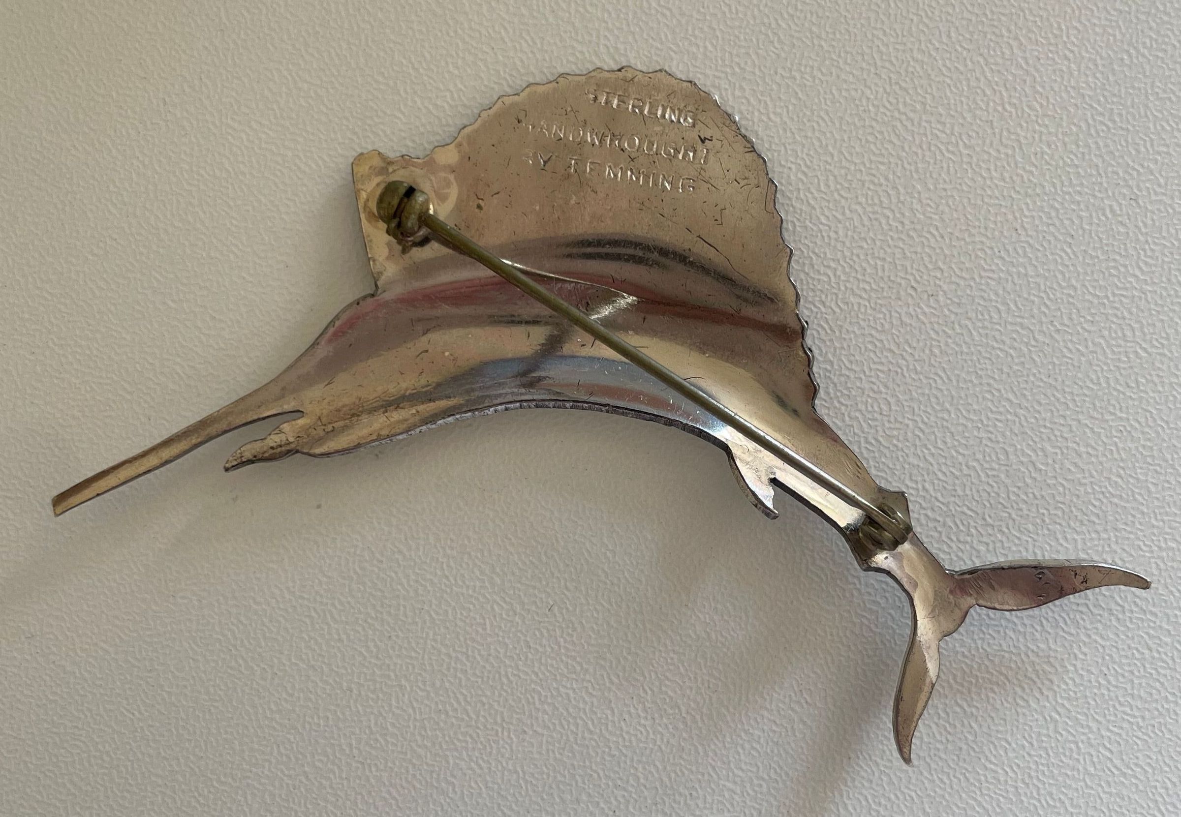 Sterling silver sailfish pin by Temming. Stamped on reverse, "Sterling, Handwrought by Temming." Bar pin backing.