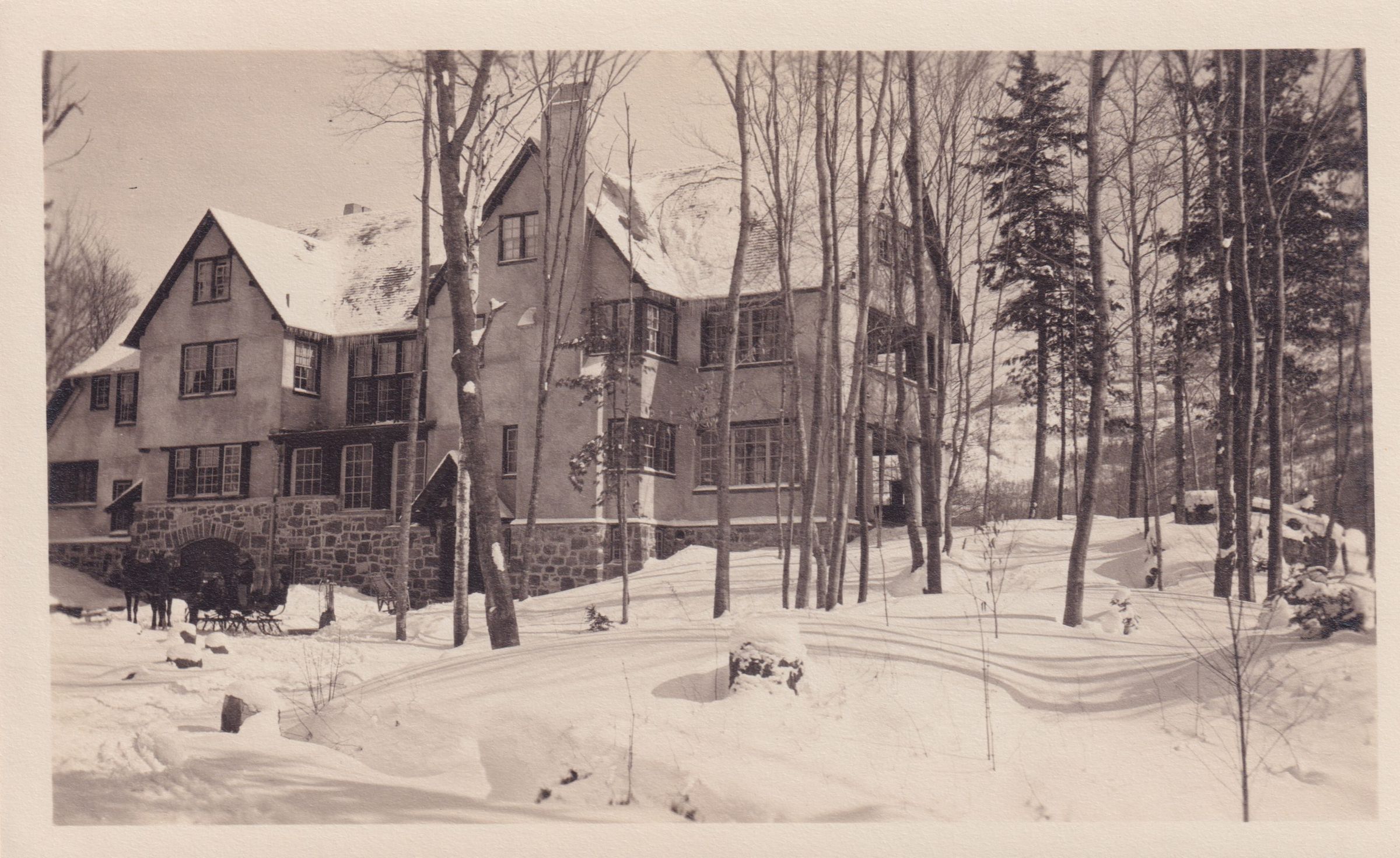 Photograph of the Alexis W. Stanley Cottage/17 Rockledge Road [66 Rockledge Lane] in the snow. A horse-drawn sleigh is standing in front of the building.