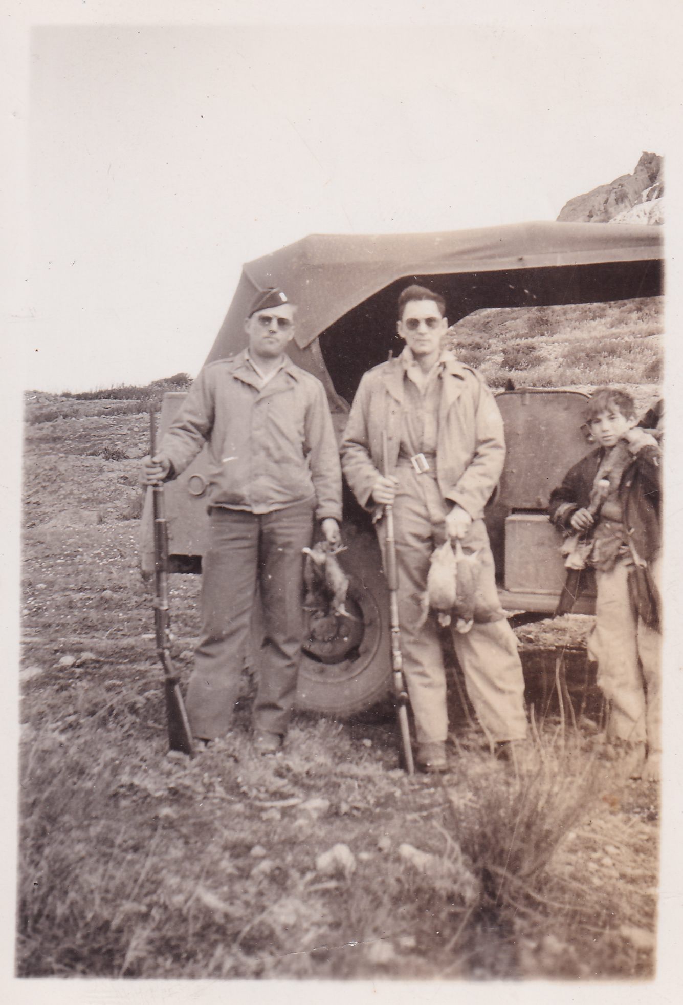 Black-and-White photograph of two men in military uniform holding rifles and dead rabbits. They are standing next to a jeep with a boy.
