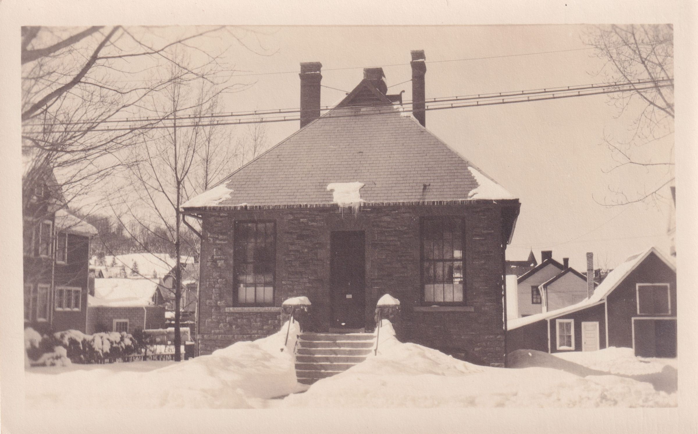 Photograph of the Saranac Laboratory in the snow. Taken straight on from Church Street.