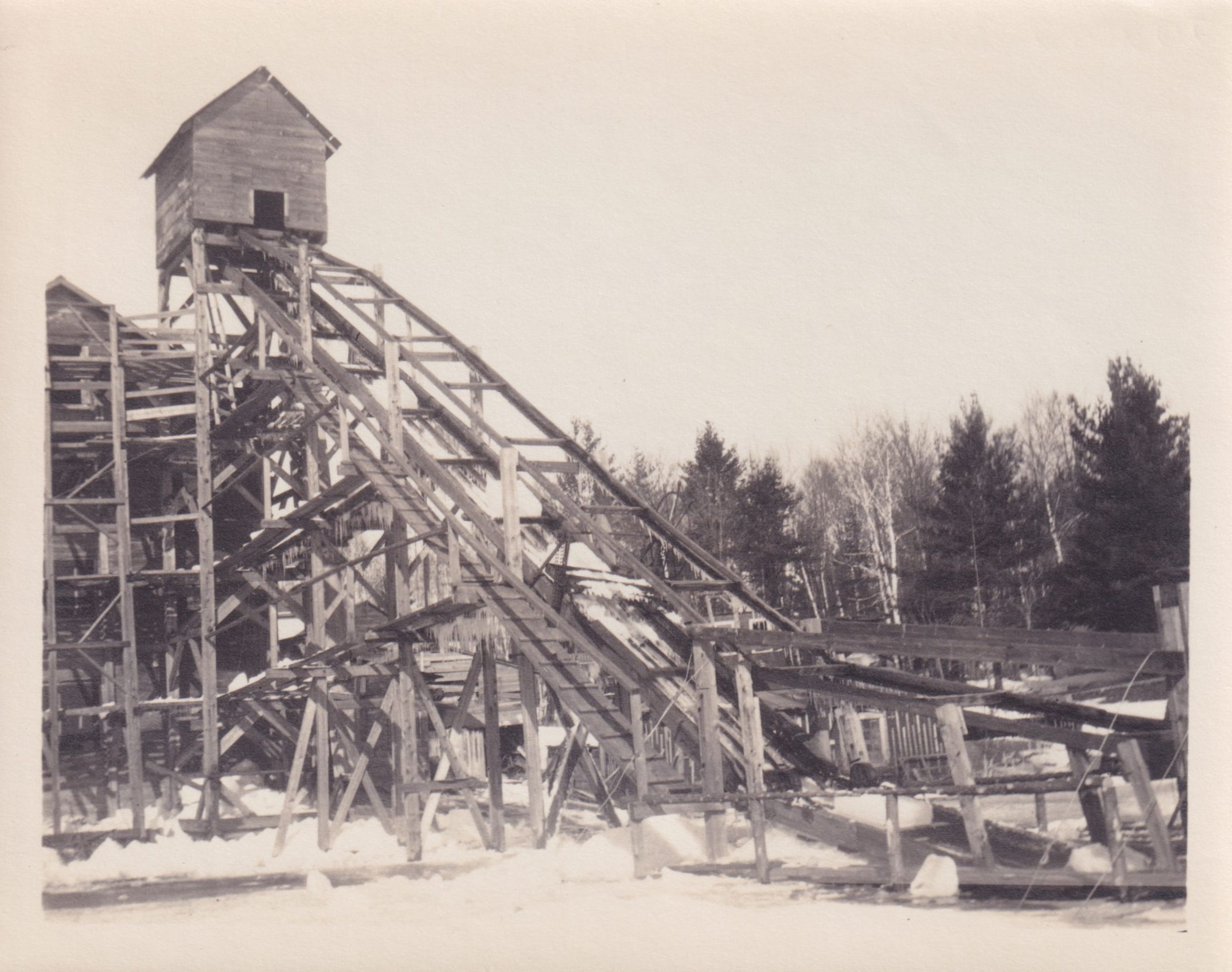 Photograph of the ice house on Moody Pond in the snow. Shows a chute or elevator system leading up to a small wooden structure.