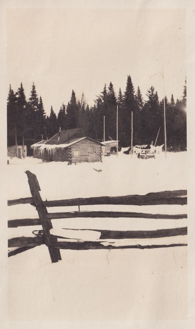 Black-and-white photograph of a snowy log cabin behind a wooden fence. There are tall pine trees in the background.
